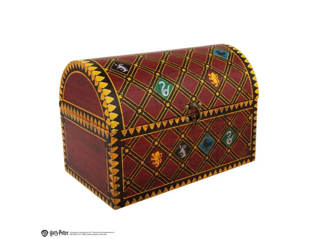 Štýlová truhla s detailnou potlačou sa po otvorení premení v pokladnici plnú darčekov, ktoré potešia každého fanúšika Rokfortu – od tematických doplnkov po zberateľské drobnosti.