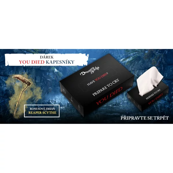 Každý z vás mal v soulsovkách určite toho jedného bossa, ktorého nešlo poraziť ani na stý pokus. A práve preto sme vám ku každej objednávke pribalili balenie You Died vreckoviek, aby ste mali po ruke niečo, do čoho slzy pri hraní roniť.