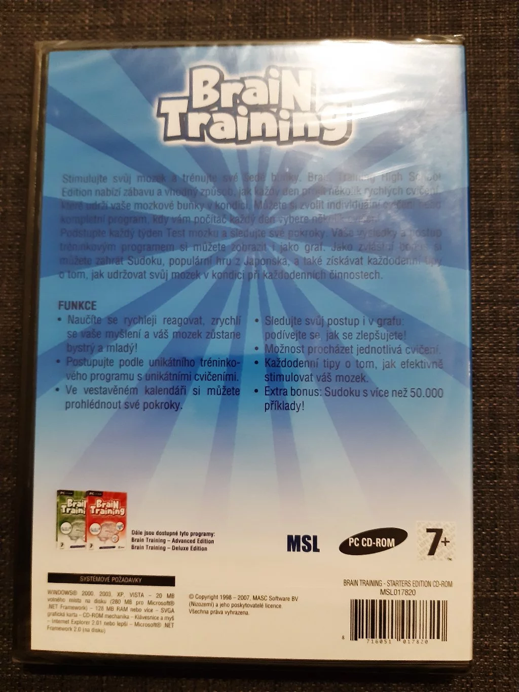 Windows 2000, XP, Vista[32bit], odskúšané na Win 7, pamäť 128MB RAM, 0,4GB voľno na disku, 32x CDROMStimulujte svoj mozog a trénujte svoje šedé bunky. Brain Training ponúka vhodný spôsob, ako každý deň prejsť niekoľko rýchlych cvičení, ktoré udržia vaše mozgové bunky v kondícii.