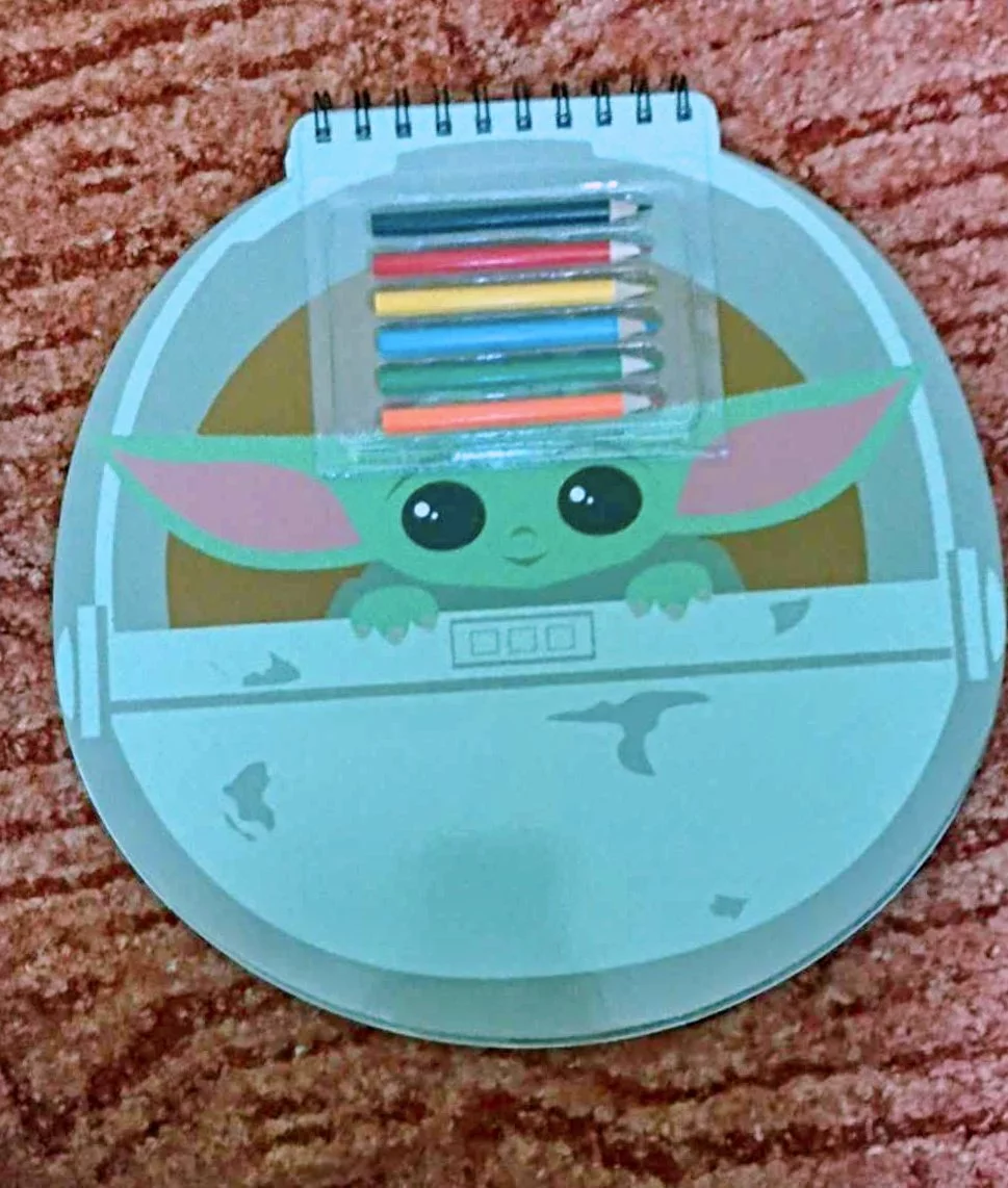 Krásne darčekové balenie zápisníka, samolepiek a pasteliek s tým najrozkošnejším stvorením v Galaxii - Grogu (Baby Yoda, The Child, Dieťa) zo seriálu The Mandalorian odohrávajúcom sa vo svete Star Wars (Hviezdne vojny).