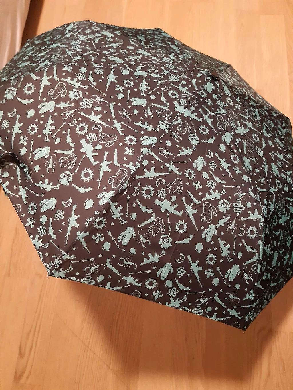 Tento deštník vypadá vysoce kvalitní s pěkným designem. Z dálky si můžete splést zbraně s palmami. Přináší trochu radosti do deštivých dnů.