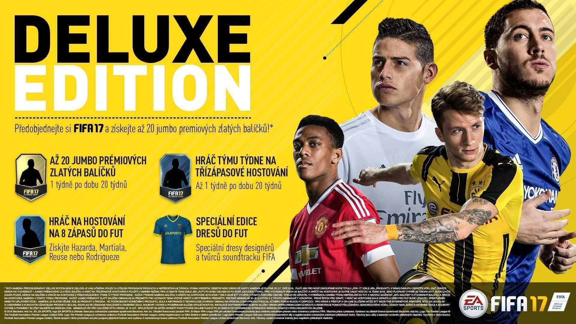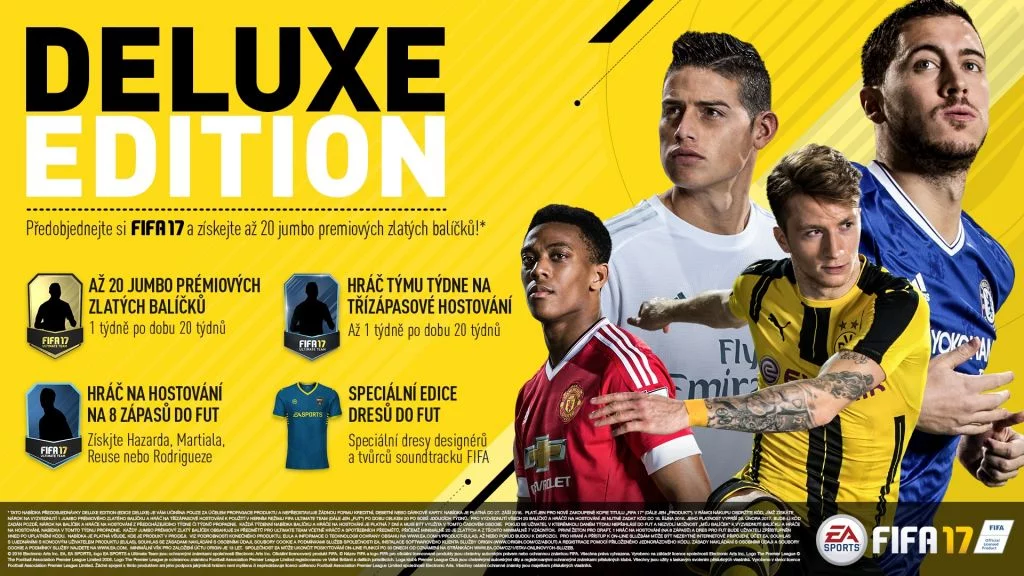 Deluxe Edition obsahuje tieto FUT bonusy: 20 prémiových Jumbo zlatých balíčkov a 20x hosťovanie hráčov tímu týždňa na 3 zápasy, špeciálnu edíciu dresov a hosťovanie jedného hráča (Hazarda, Martiala, Reusa alebo Rodrigueza) na 8 zápasov.