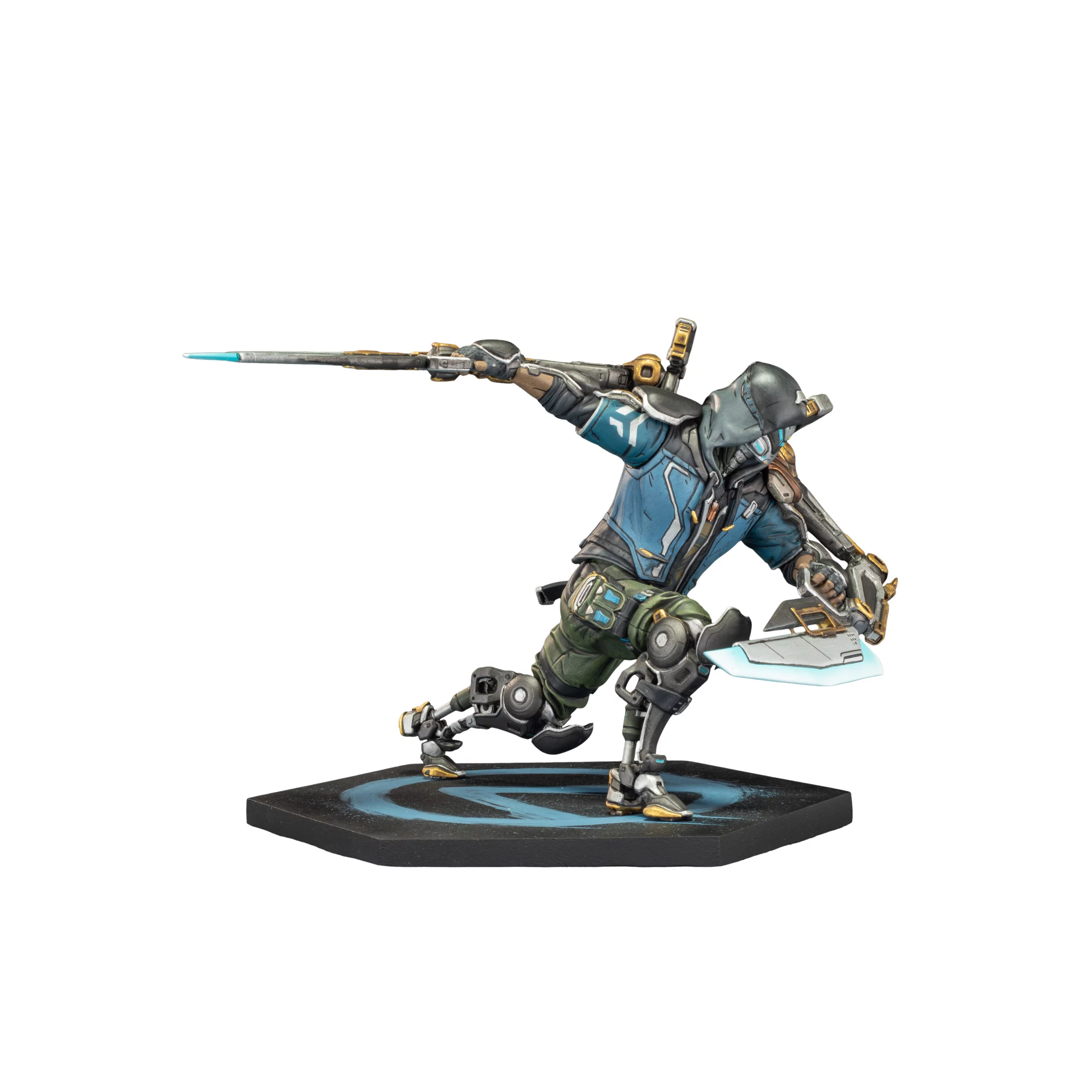 Jeho elegantné brnenie, futuristické čepele a dynamická póza dokonale vystihujú štýl lovca, ktorý nikdy neminie svoj cieľ.