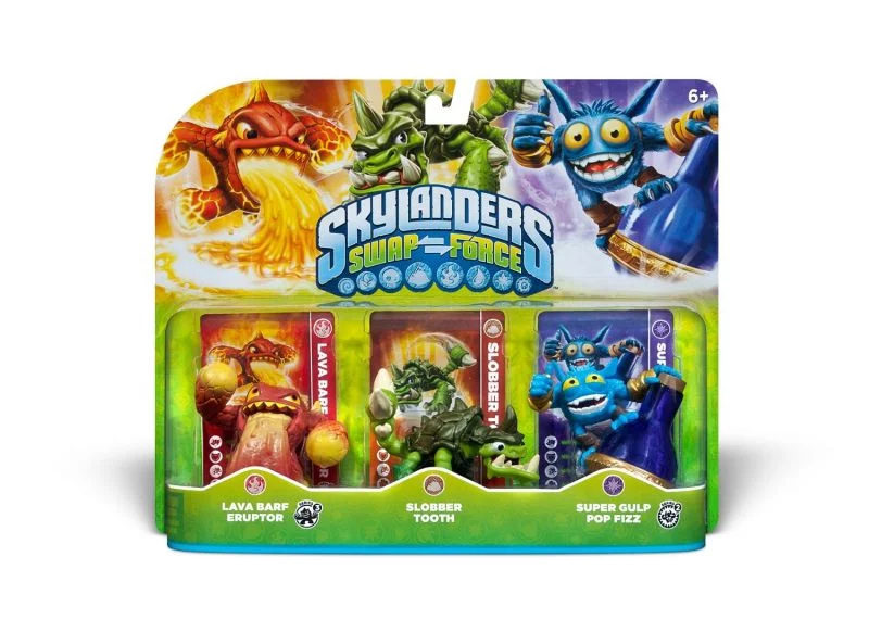 Includes: Skylanders SWAP Force Triple Character Pack (Lava Barf Eruptor, Slobber Tooth, Super Gulp Pop Fizz), Trading Card, and Sticker Sheet