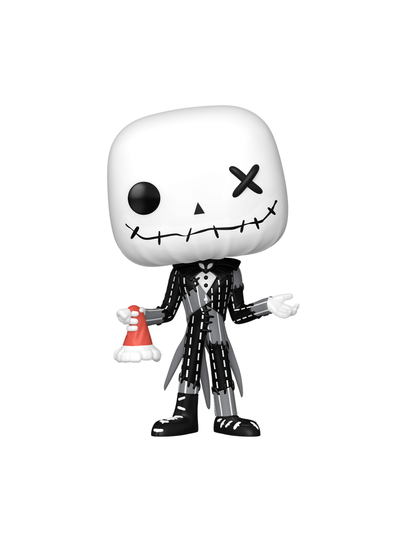 Funko POP! figúrka Jacka Skellingtona z The Nightmare Before Christmas zachytáva legendárneho Kráľa Halloweenu v jeho typickom pruhovanom obleku, tentoraz s vianočnou čiapkou v ruke.