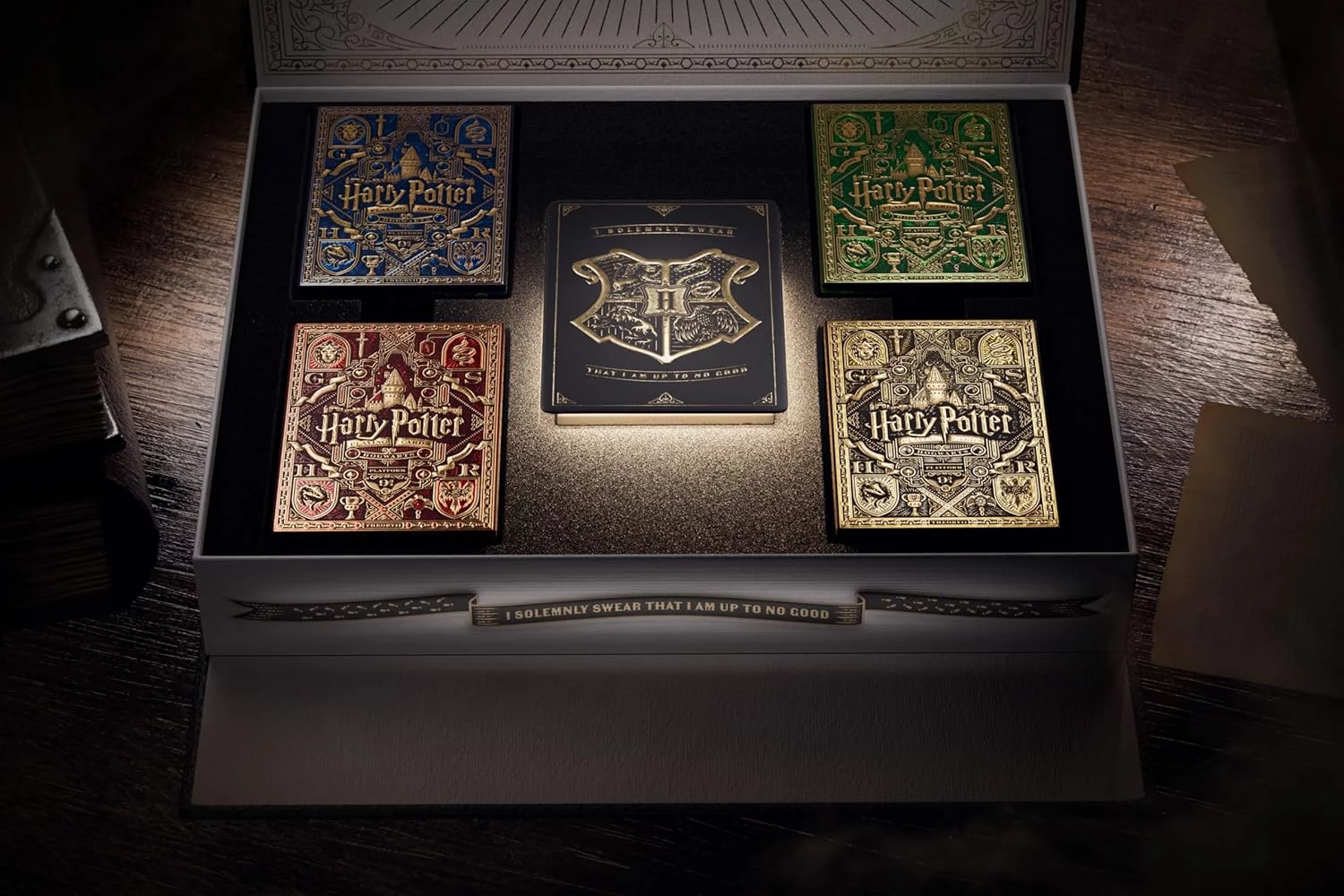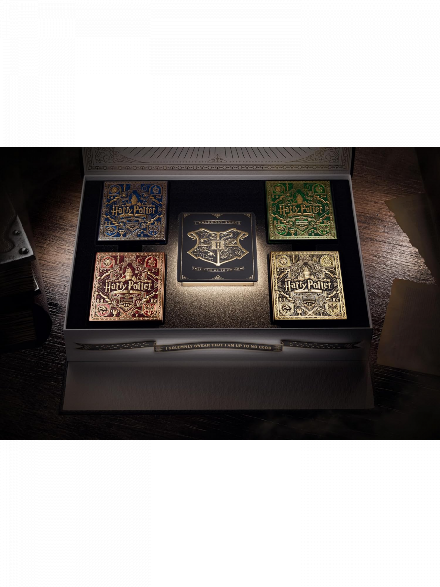 Táto prémiová sada hracích kariet Harry Potter obsahuje štyri balíky s motívmi bradavických koľají a jeden predtým nevydaný prémiový balík! Zberateľská krabička sa navyše vďaka jedinečnému mechanizmu vie sama otvoriť! Perfektný darček pre všetkých karbaníkov, ktorí podľahli kúzlam sveta Harryho Pottera.