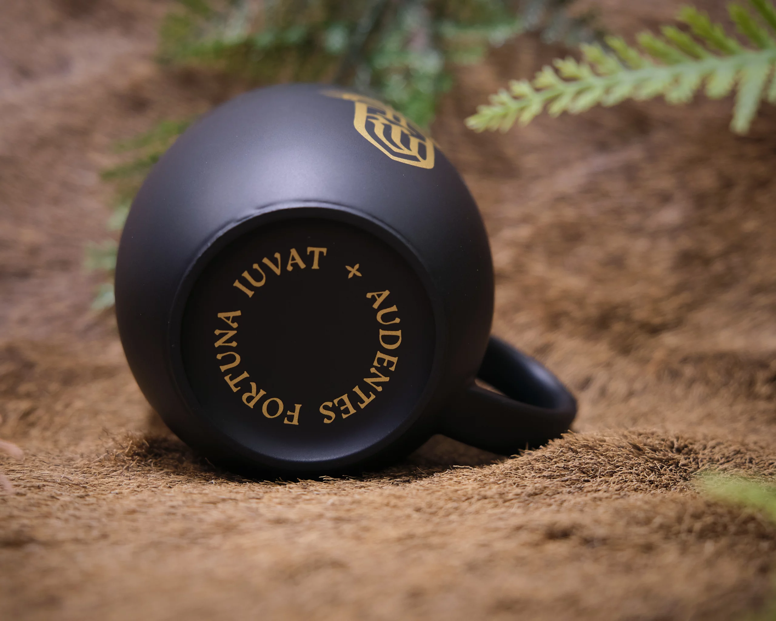 Elegantný čierny hrnček z českej keramiky pre milovníkov minimalizmu a Kingdom Come: Deliverance II. Ikonický emblém hry a jej logo krásne kontrastujú s tmavým matným povrchom a vytvárajú tak veľmi luxusný dojem. Na dne hrnčeka potom nájdete už len kultové latinské príslovie Audentes Fortuna Iuvat!