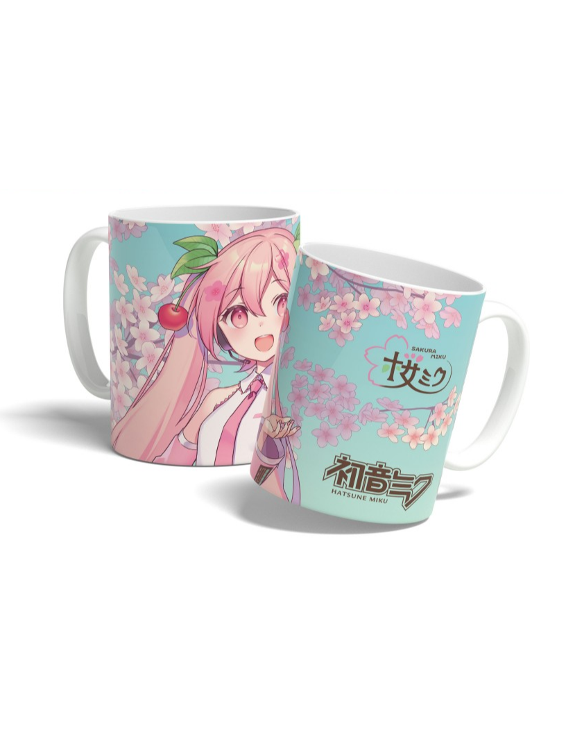 Keramický hrnček s motívom Sakura Miku v kvetinovom dizajne sakur, ideálny pre milovníkov Vocaloid a jarnej atmosféry.