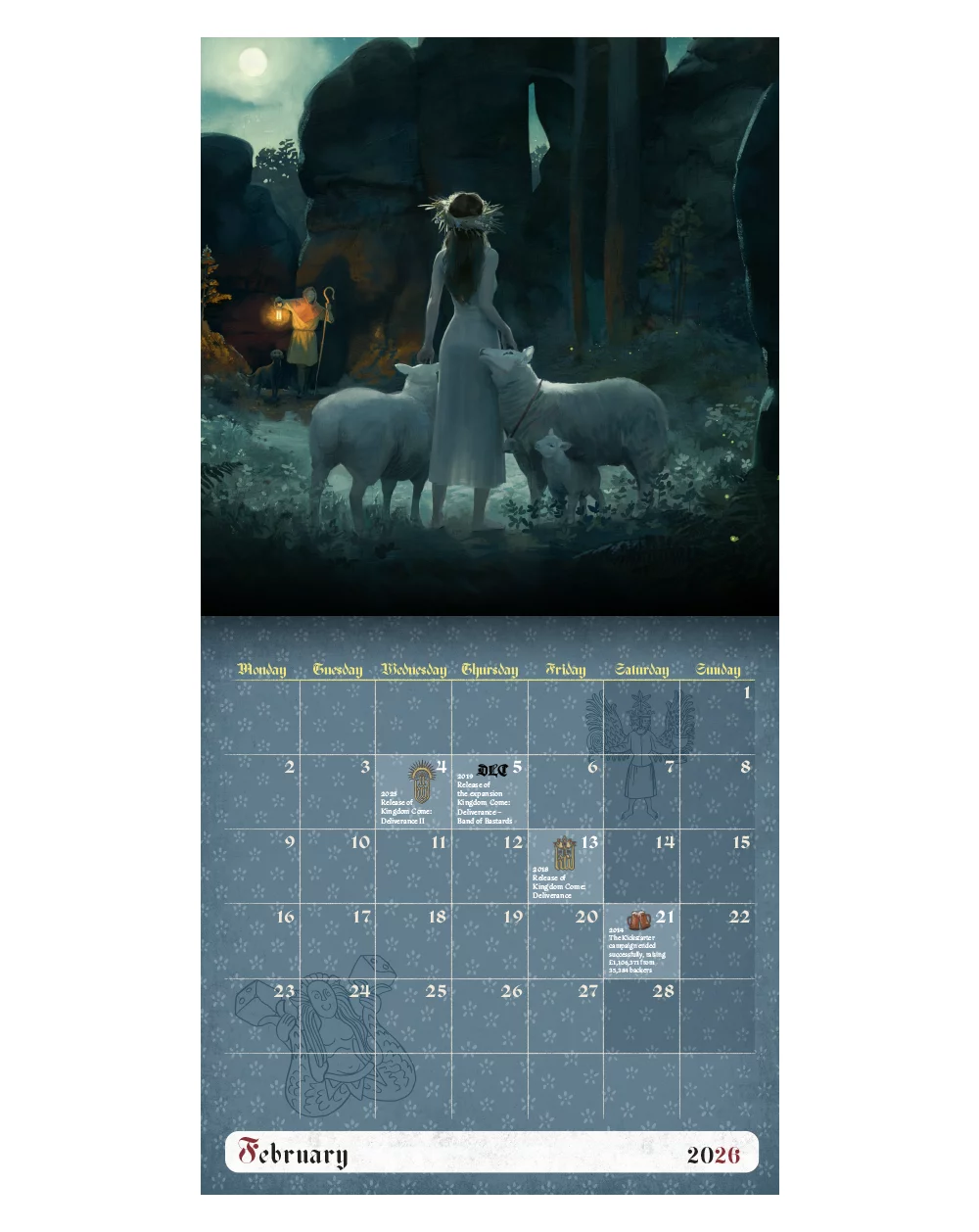 Kalendár obsahuje aj významné dátumy spojené so sériou Kingdom Come a je tak nielen praktickým, ale aj zberateľským kúskom pre všetkých fanúšikov veľkolepého diela Warhorse Studios.