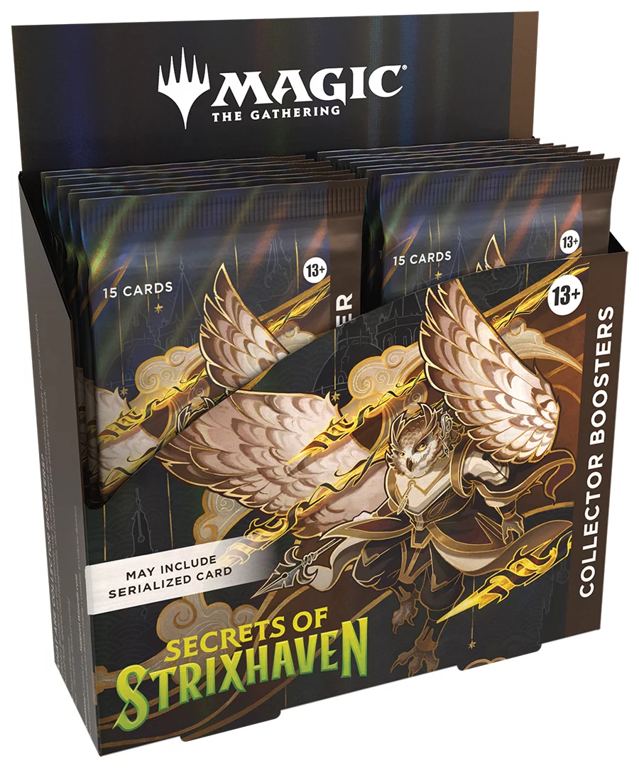 Collector Boostery Secrets of Strixhaven predstavujú ten najlepší spôsob, ako obohatiť svoj čarodejnícky arzenál o jedinečné štýly kariet. Každý booster obsahuje niekoľko rare a/alebo mythic rare kariet, veľké množstvo fóliových kariet, základnú zem v plnoformátovom vyhotovení a karty Mystical Archive s výraznou novou grafikou a špeciálnymi rámčekmi.