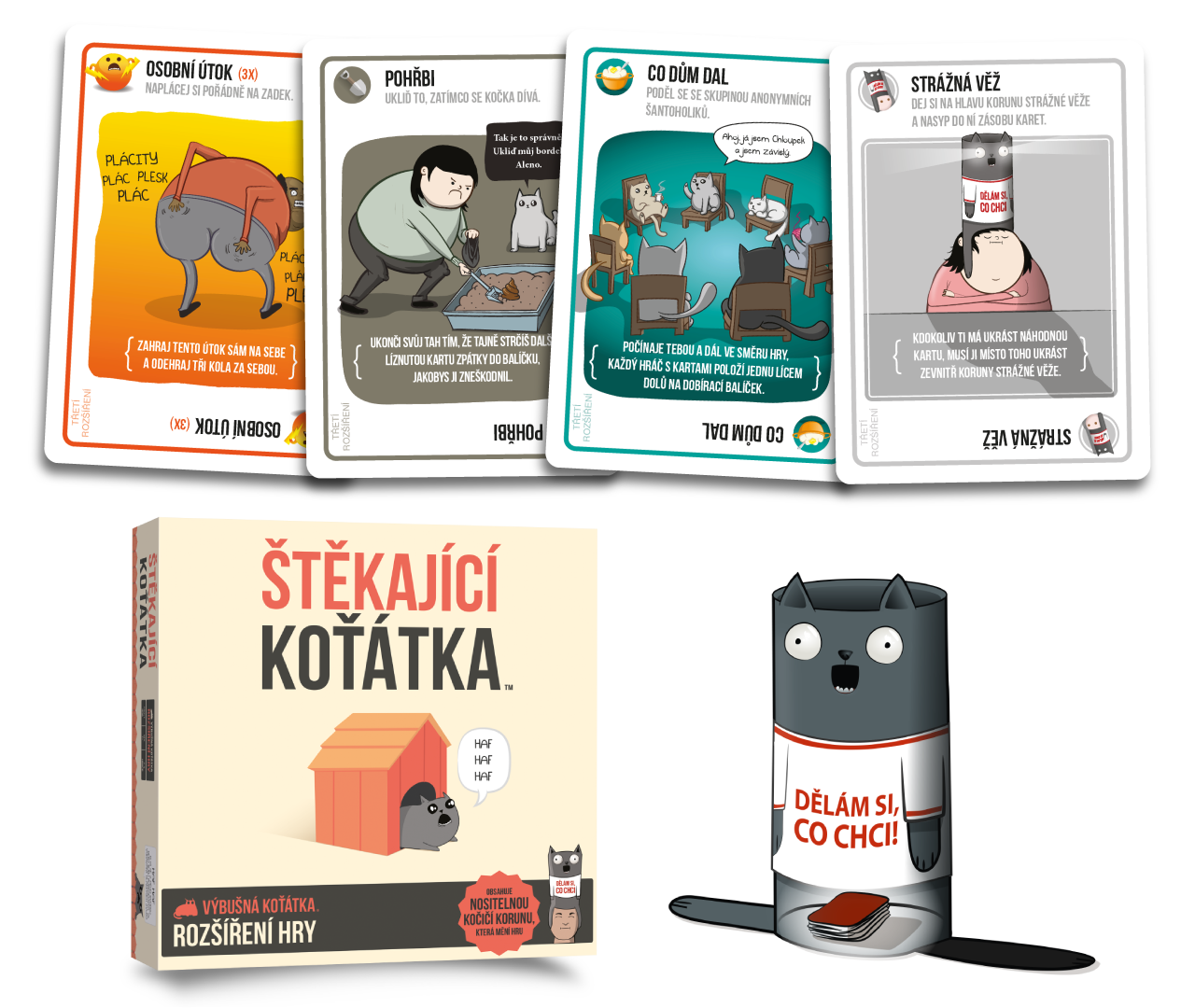 HAF-HAF-HAF! Na štekotu psa nie je nič podivného, ale keď šteká mačka? Stačí si predstaviť túto "divnosť" a hneď vám musí byť jasné, že 3. rozšírenie vnesie do vašej obľúbenej mačacej hry opäť nové mocné akcie a efekty, ktoré menia hru! Na čo sa iste všetci tešíte najviac, je nositeľná mačacia koruna alias Strážna veža! Rozhodne sa nejedná o nejakú hanbu, ba naopak! Kto korunu nosí, ten sa vyhne krádežiam od ostatných hráčov ... aspoň do tej doby, než mu dôjdu extra karty v zásobníku. A kto by radšej škodil, než robil zo seba mačacieho kráľa, tomu sa nepochybne zapáči Štekajúce mačiatko ... Haf-Haf-Haf! Na to, čo robí, sa ho radšej opýtajte sami!
