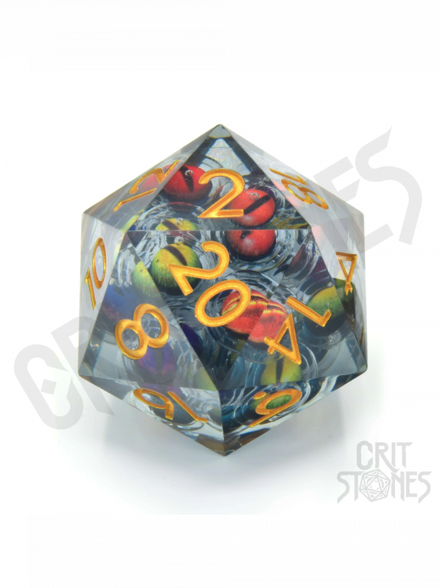 Obria D20 kocka Beholden - Floating Eyes ukrýva v priehľadnom tele plávajúce oči, ktoré sledujú každý tvoj hod. Zlatooranžové čísla kontrastujú s tmavým vnútrom a dodávajú jej zlovestný, hypnotický vzhľad.