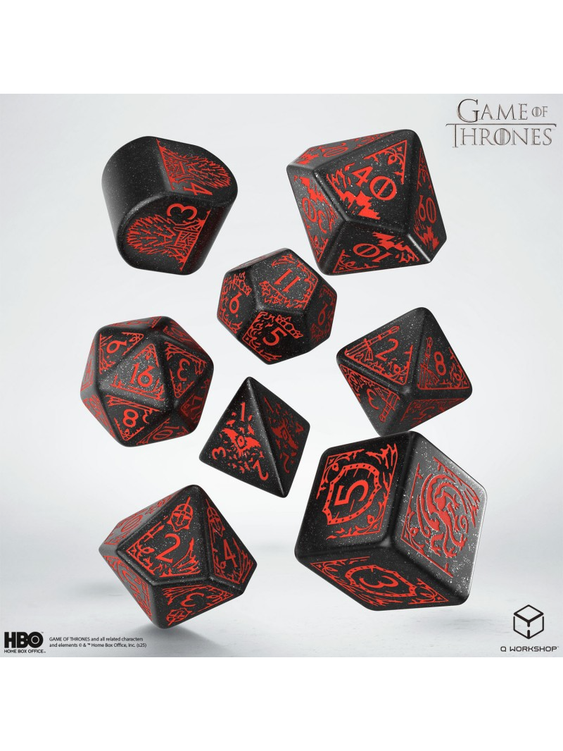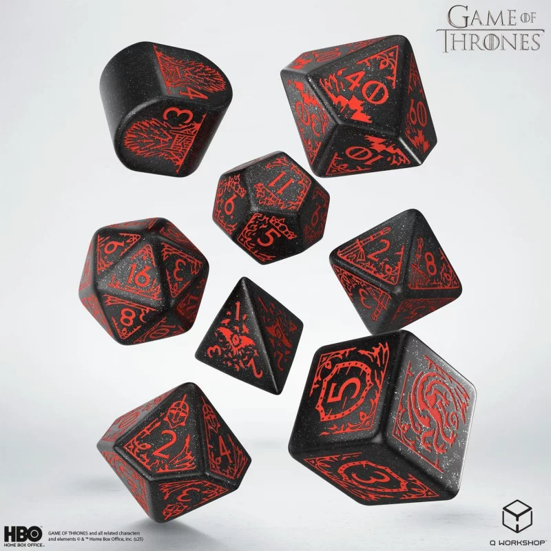 Rozpáľte svoje hry dračím ohňom s kockami Game of Thrones - Targaryen. Osemdielny set v čierno-červenom prevedení zdobí znak trojhlavého draka a evokuje moc aj vášeň rodu z Valýrie.