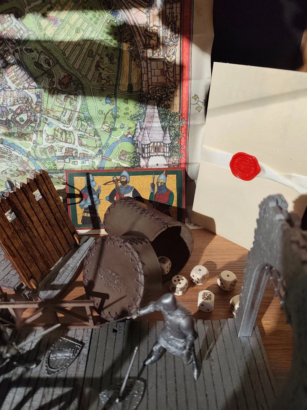 Štýlový kožený kalíšok s viečkom a sada šiestich drevených kociek s logom Warhorse Studios – ideálny spoločník pre chvíle oddychu pri ohni, na cestách aj v krčme. Ručne vyrábané z poctivej hovädzej kože v srdci českých zemí, táto sada v sebe spája remeselnú kvalitu a stredovekú atmosféru.