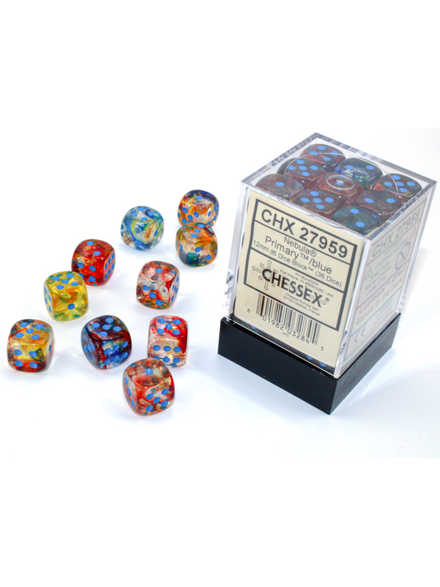 Sada Nebula - Primary (36 ks) od Chessex prináša priesvitnú zmes červenej, modrej a žltej s jasne modrými bodkami a efektom Luminary™, ktorý po nasvietení premení kocky na žiariaci hviezdny vír.