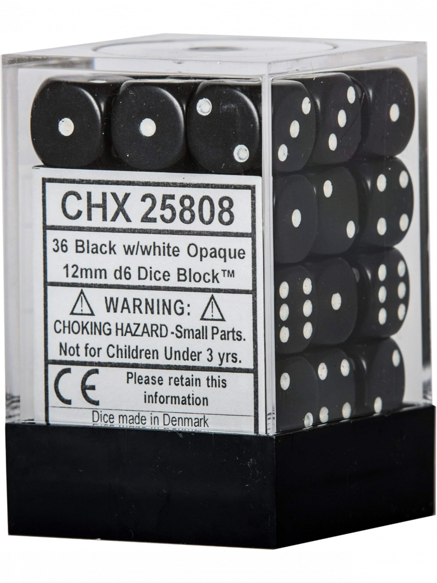 Sada šesťstenných kociek Chessex Opaque - Black (36 ks) v elegantnej čiernej farbe s bielymi bodkami je ideálna pre stolové i spoločenské hry.