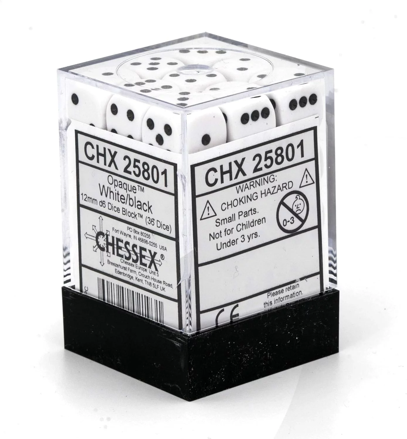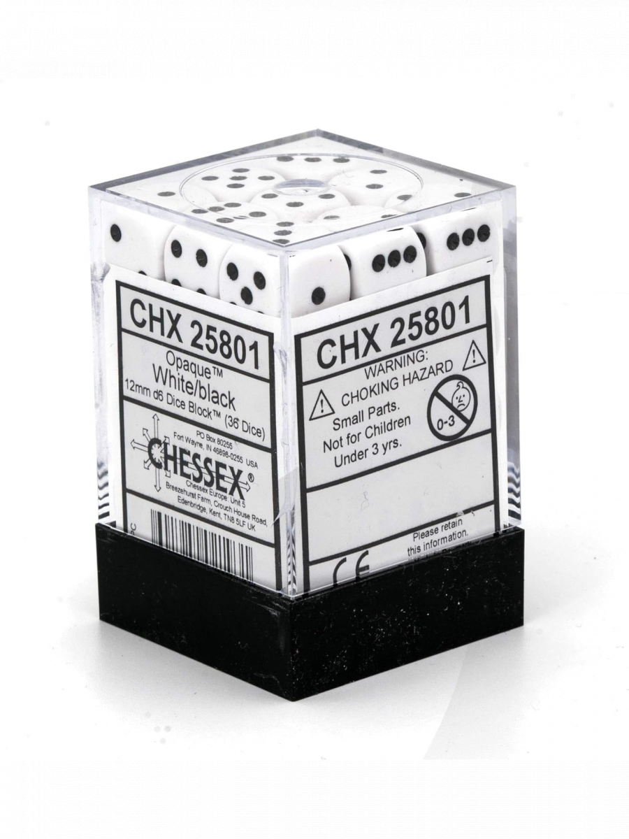 Sada šesťstenných kociek Chessex Opaque - White (36 ks) v klasickom bielom prevedení s čiernymi bodkami je ideálnou voľbou pre každého hráča stolových a doskových hier.