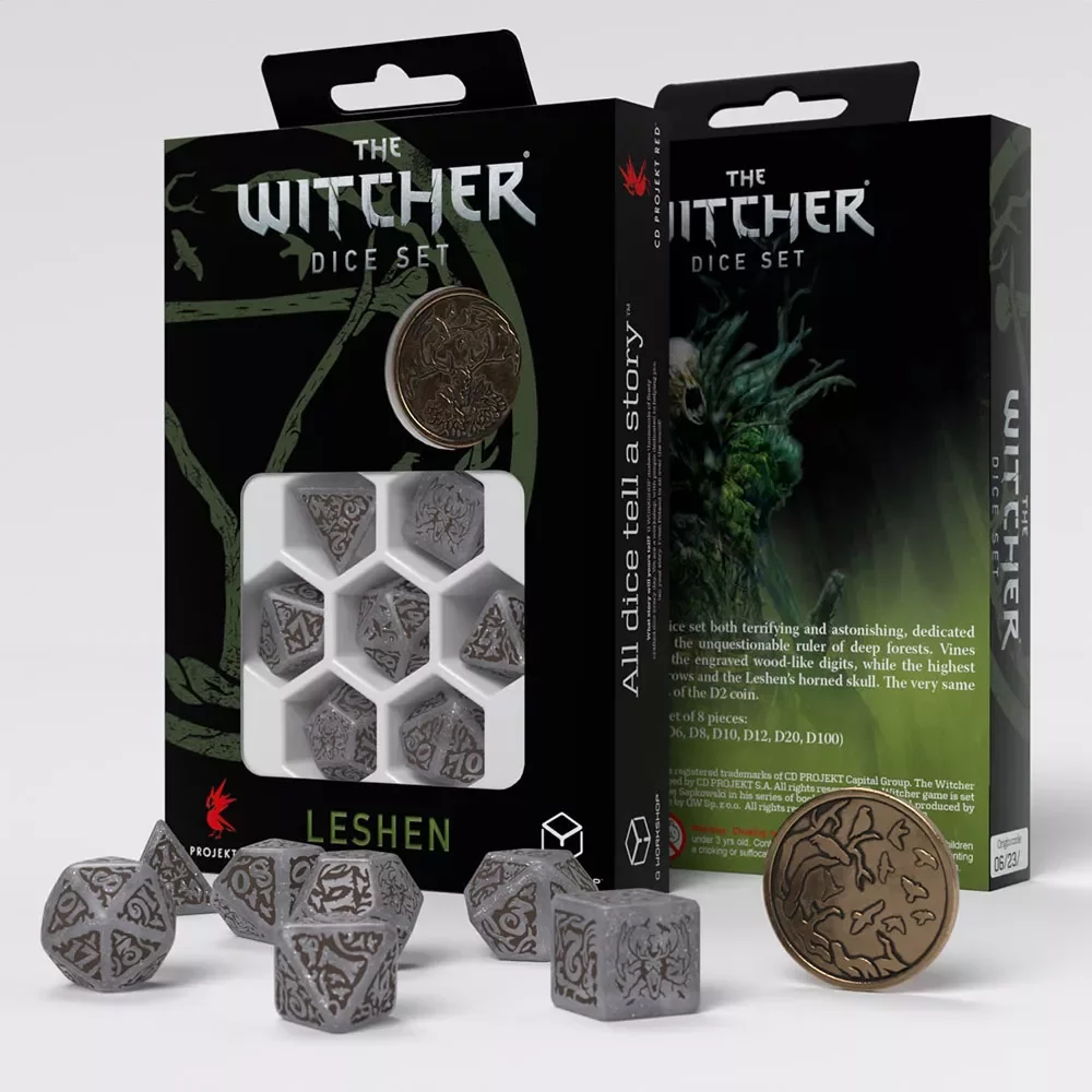 Sada siedmich hracích kociek rôznych formátov inšpirovaná kultovým svetom Zaklínača (Witcher) oživí vaše sedenie pri Dračiaku! Tento set bol venovaný Leshenovi - príšere, ktorú často sprevádza kŕdeľ vrán. Strany kociek s najvyššou hodnotou a reverz mince zdieľajú vyobrazenie Leshenovej rohatej lebky, zatiaľ čo na averze mince sa hemží vrany. V balení nájdete aj unikátnu mincu.