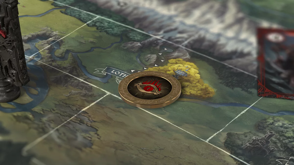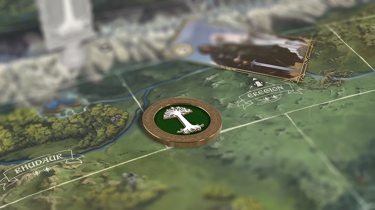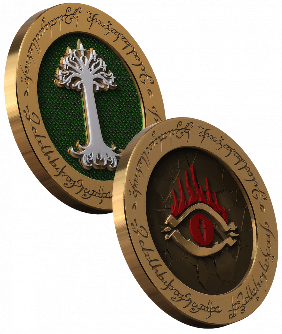 Prémiová bronzová minca výzvy vznikla ako exkluzívny doplnok ku hre Pán prstenů: Konfrontace. Na jednej strane nesie emblém Spoločenstva, inšpirovaný legendárnym Bielym stromom Gondoru, zatiaľ čo druhá strana zobrazuje vševidiace Sauronovo oko zasadené medzi zubaté hrebene Ephel Dúath.MINCA ROZHODNE