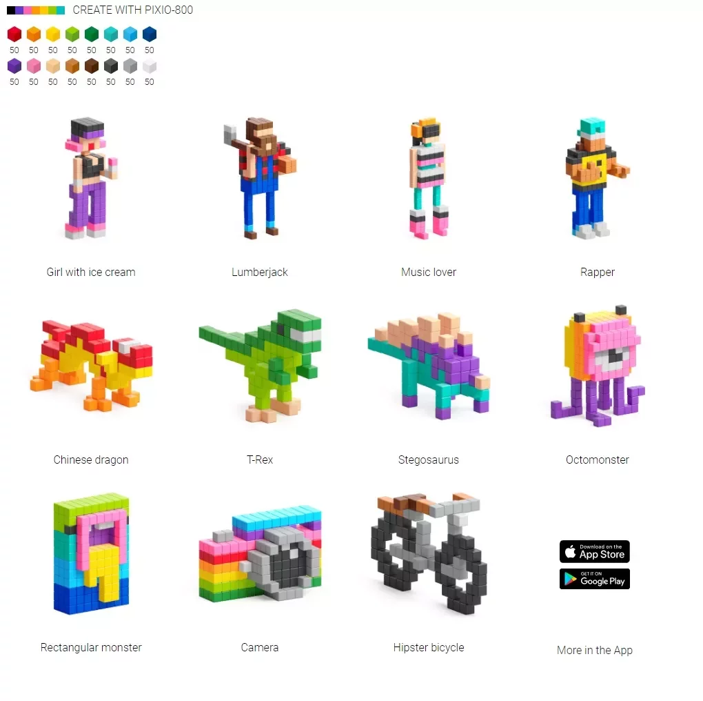 V každom balení produktov PIXIO je zadarmo kód, ktorý umožňuje prístup k exkluzívnemu obsahu aplikácie. Stiahnite si aplikáciu z Google Play alebo APP Store a preskúmajte viac ako 1000 nápadov, ako tvoriť pixelové objekty a 3D obrazce.