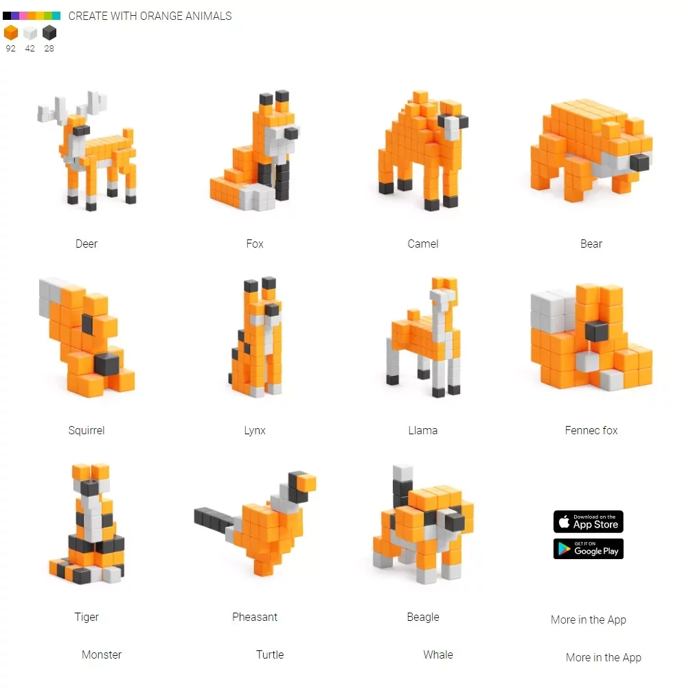 Dizajnový rad PIXIO Orange Animals obsahuje 162 blokov PIXIO v 3 farbách. Umožnia oživiť vaše kreatívne nápady a prinesú farebnú radosť do života. Začnite stavbou jednoduchých modelov podľa pokynov a potom, keď budete pripravení, prejdite na vytváranie vlastných návrhov. S touto sadou postavíte mnoho zvierat ako sú tiger, líška, medveď, lama, jeleň a mnoho ďalších.