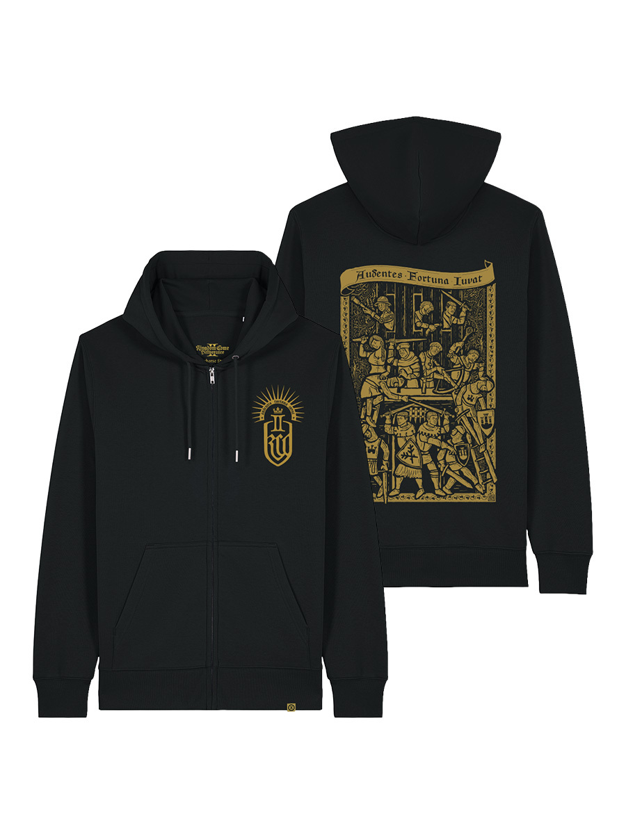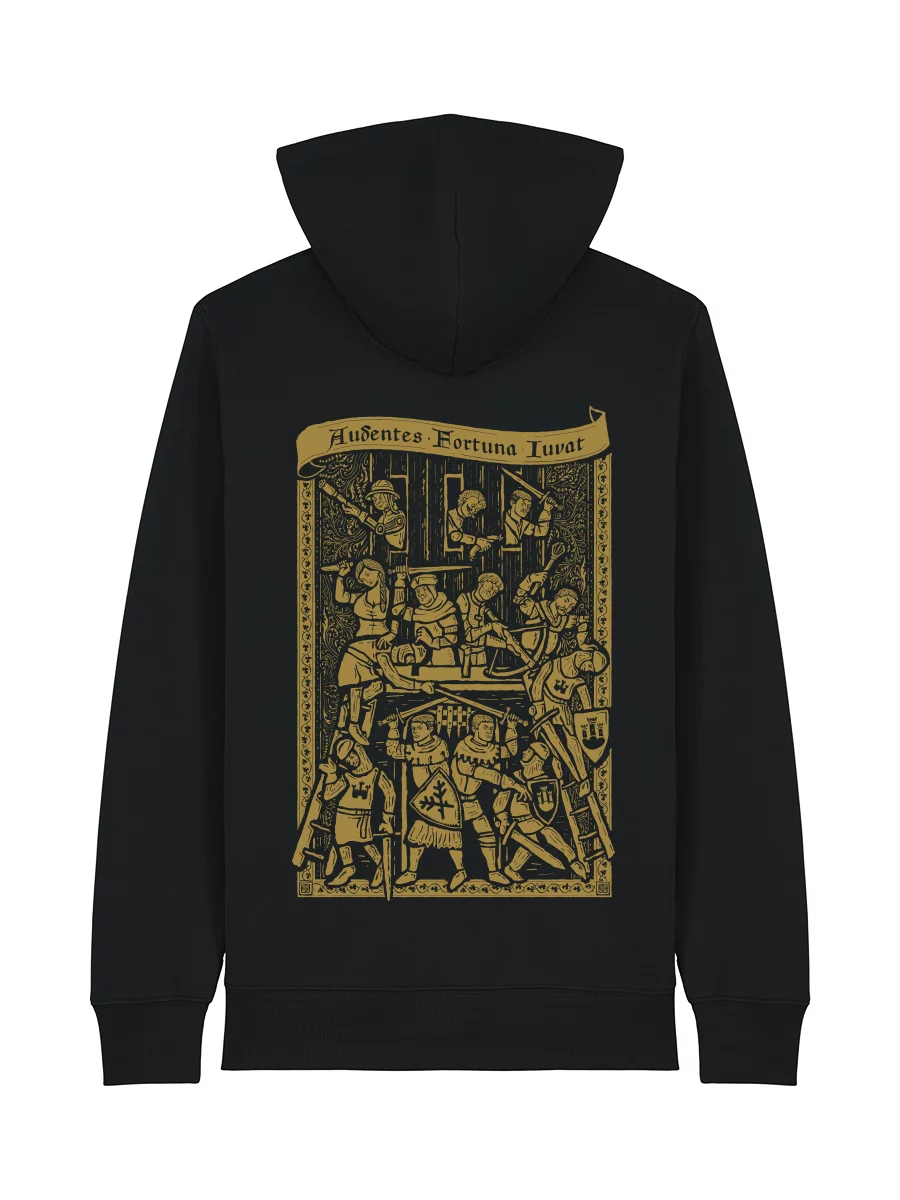 Suchdol patrí k momentom, na ktoré sa v Kingdom Come: Deliverance II jednoducho nezabúda. Bitka, kde sa láme situácia, všade je chaos a vy len dúfate, že to nejako dopadne. Presne túto atmosféru sme preniesli na chrbát mikiny v podobe ilustrácie inšpirovanej stredovekými rytinami, kde nechýbajú všetci najobľúbenejší hrdinovia. Čím dlhšie sa na ňu pozeráte, tým viac detailov objavíte.