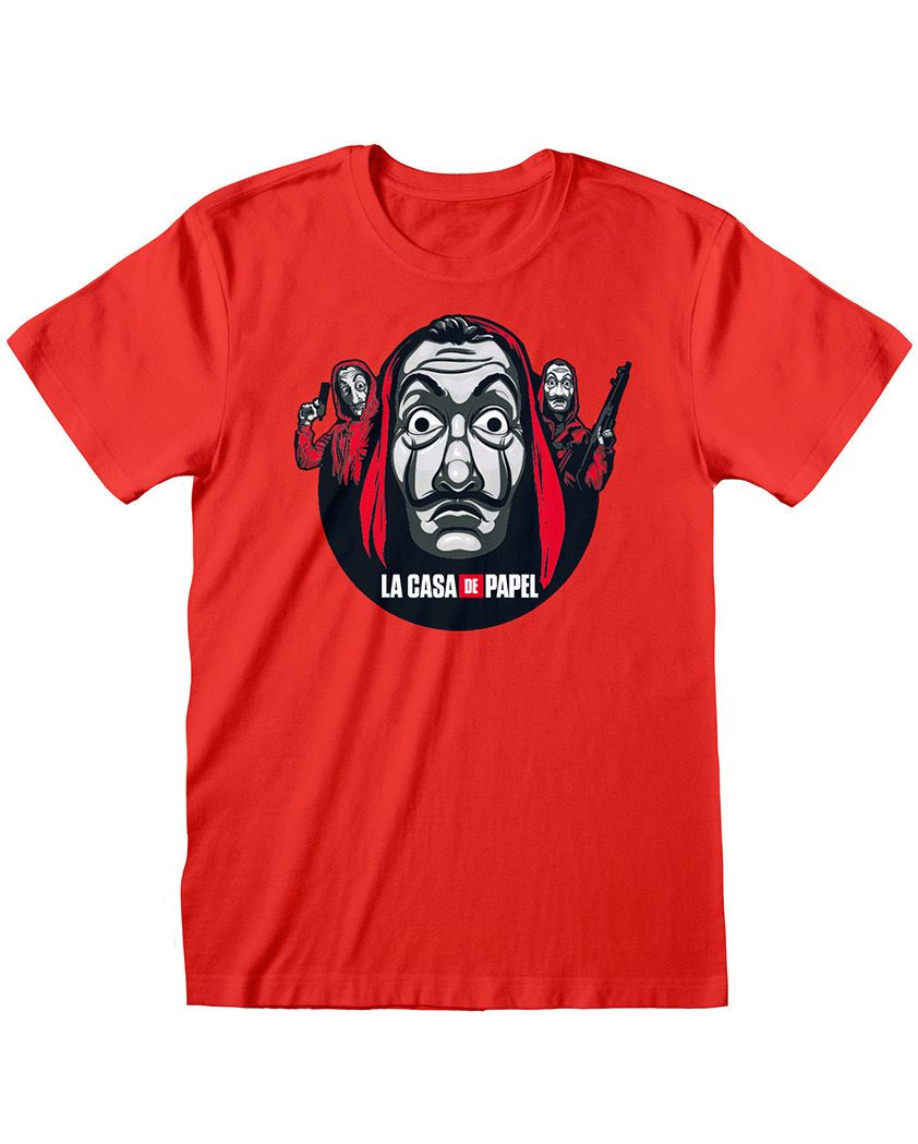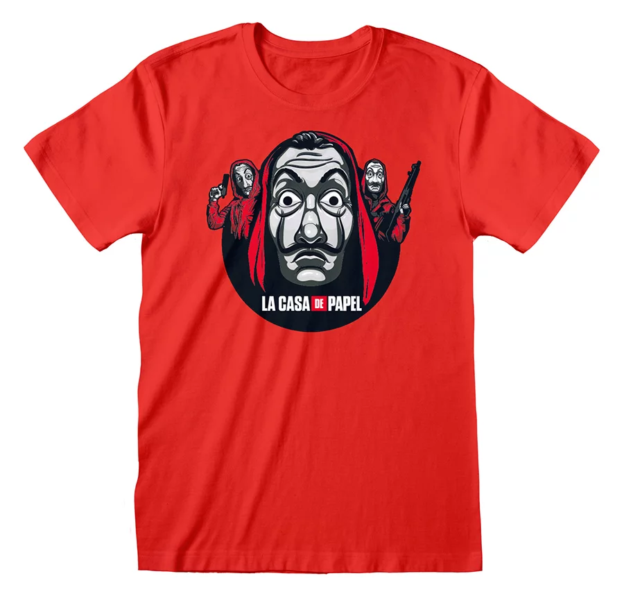Pokiaľ vás zaujal seriálový hit Netflixu Money Heist (v origináli La Casa de Papel, v češtine Papírový dům), potom sa vám určite bude páčiť toto kvalitné červené tričko so štylizovanou potlačou, ktorá znázorňuje masku maliara Salvatora Dalího a dvoch lupičov so zbraňami.