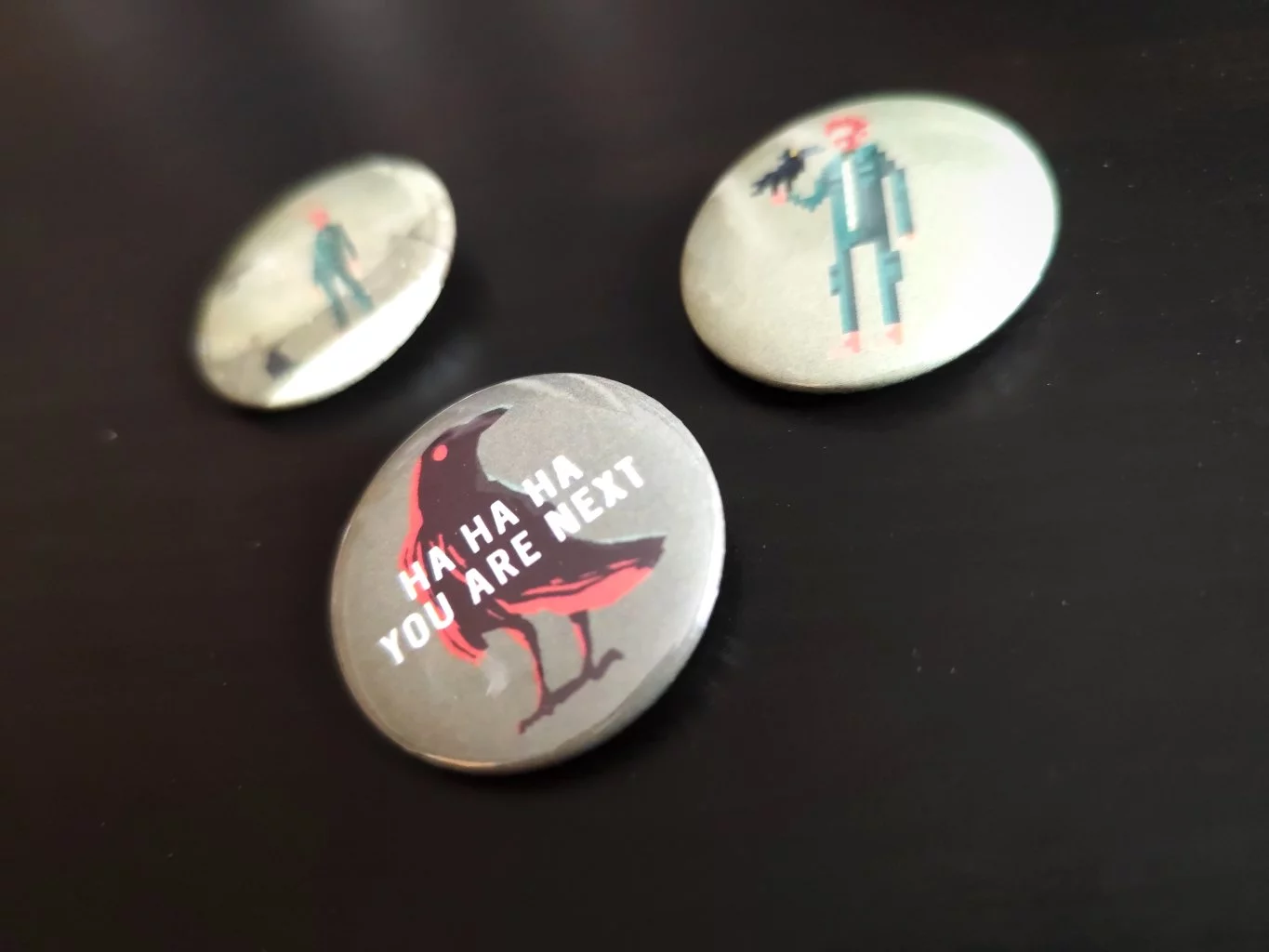Štvorica odznakov s motívom českej príbehovej plošinovky Ministry of Broadcast. Nájdete na nich hlavného hrdinu, sarkastickú vranu, aj všadeprítomné oko veľkého súdruha ... teda brata.