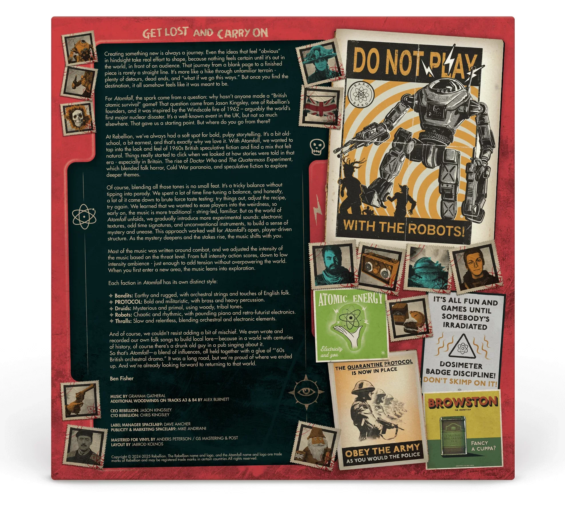 Limitovaná edícia vinylového soundtracku je zabalená v rozkladacom obale, ktorý zdobí propagandistické umenie a kľúčové motívy z hry. Prináša tak napätie Atomfallu priamo na váš gramofón – každá melódia je oknom do jeho sveta.