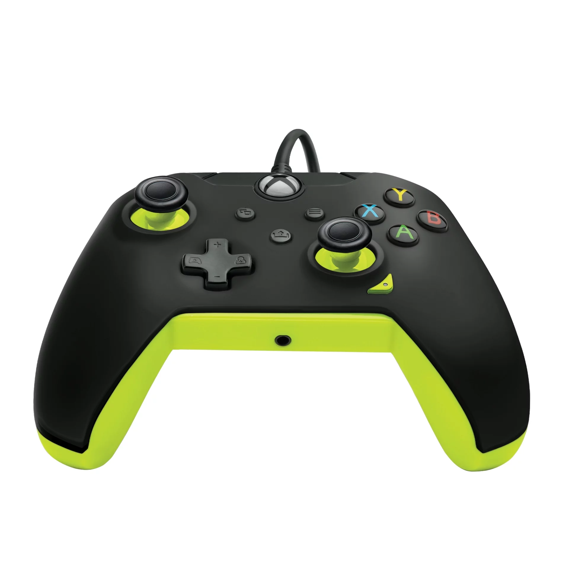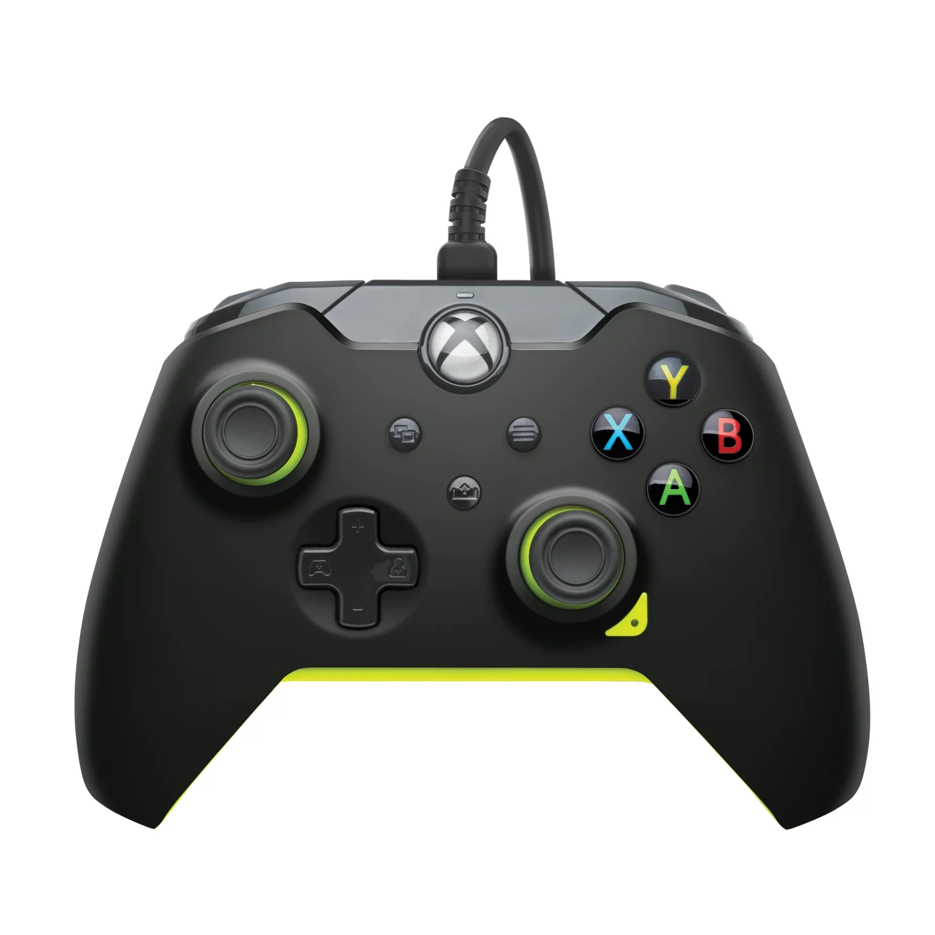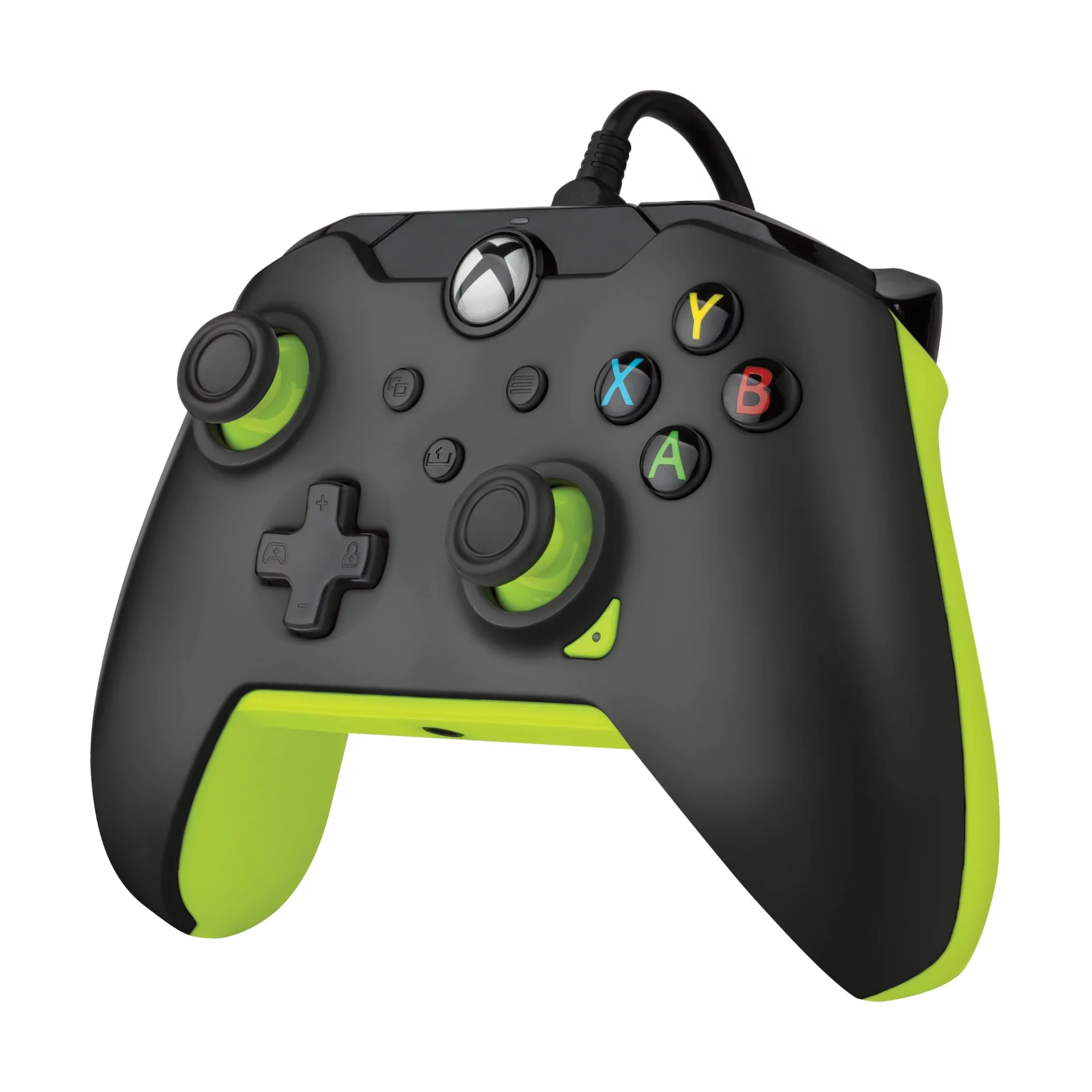 Ovládač PDP Electric Black pre Xbox Series X|S, Xbox One a Windows kombinuje elegantný čierny dizajn s neónovo zelenými detailmi, ktoré mu dodávajú energický vzhľad.