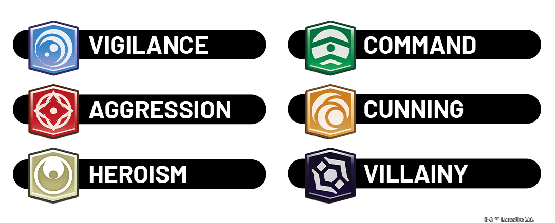 Jednotlivé farby sú v Star Wars: Unlimited pomenované ako aspekty a máme ich tu rovno 6 (Vigilancia, Command, Aggression, Cunning, Heroism a Villainy). Balíček je najčastejšie tvorený z 3 aspektov, ktoré korešpondujú s kombináciami farieb vodcu a základne. Pokiaľ by hráč chcel hrať kartu mimo aspekt svojho vodcu a základne, musí k základnej cene karty ešte navyše doplatiť 2 akékoľvek zdroje.