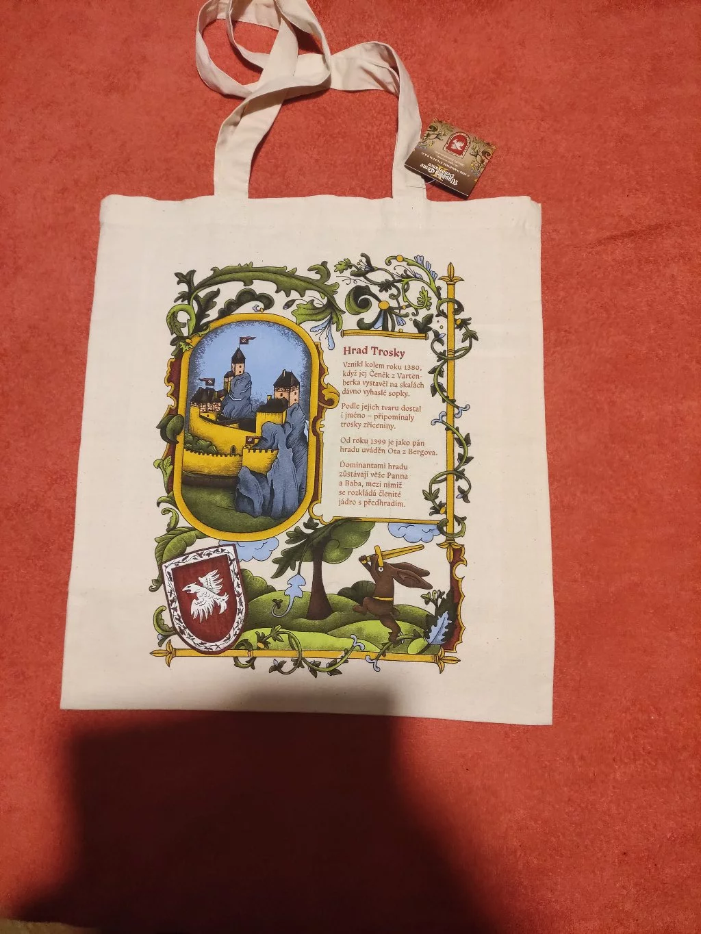Plátenná taška s iluminovaným motívom hradu Trosky pripomína stredoveké rukopisy a zachytáva krásu aj príbeh tejto ikonickej zrúcaniny, ktorá ožíva vo svete Kingdom Come: Deliverance II.