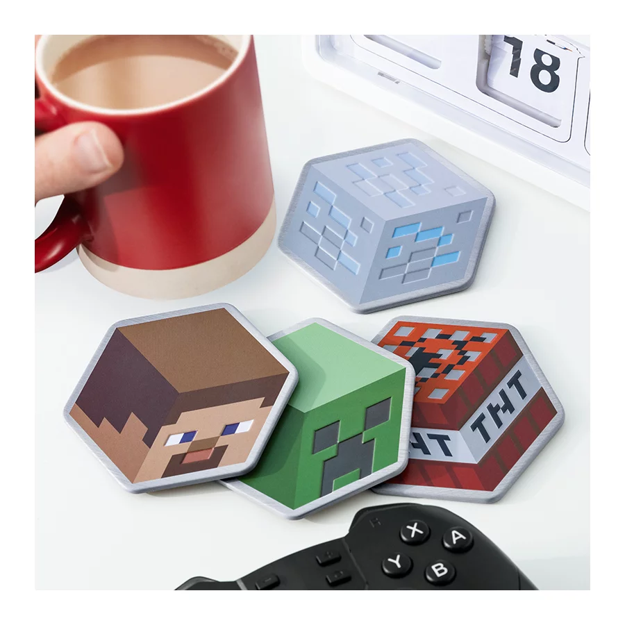 Štýlový set podložiek pod poháre Minecraft – Metal Coasters poteší každého fanúšika ikonickej kockovej hry.