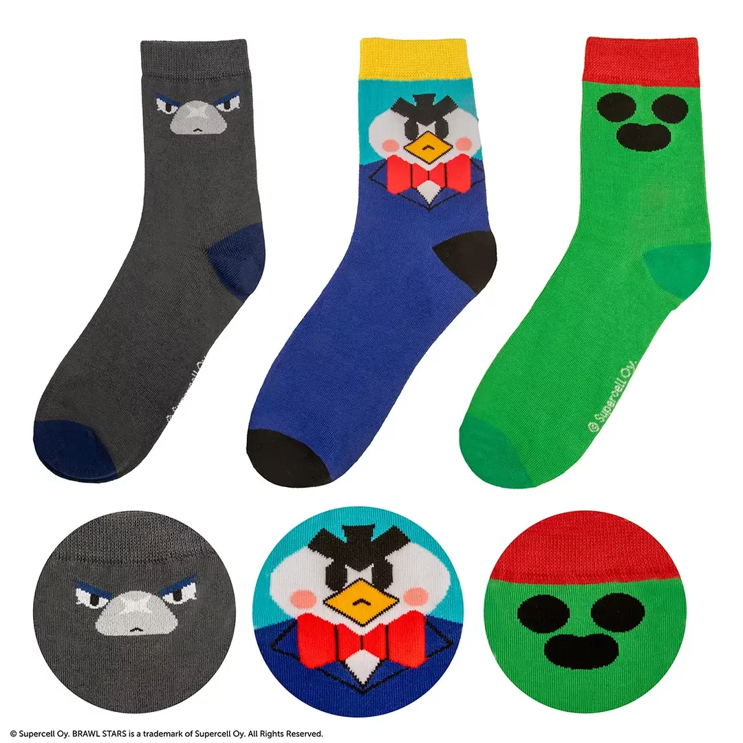 Vneste do šatníka trochu hernej energie. Tento set troch ponožiek z Brawl Stars predstavuje trojicu obľúbených bojovníkov, Spikea, Crowa a Mr. P, každý s vlastným výrazným dizajnom.