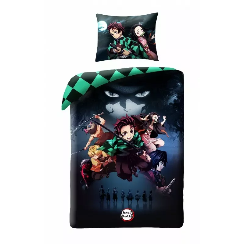 Hlavné postavy japonského anime Demon Slayer na príjemných obliečkach pre vankúš a prikrývku.Rozmery: poťah na deku (140 x 200 cm), poťah na vankúš (70 x 90 cm)