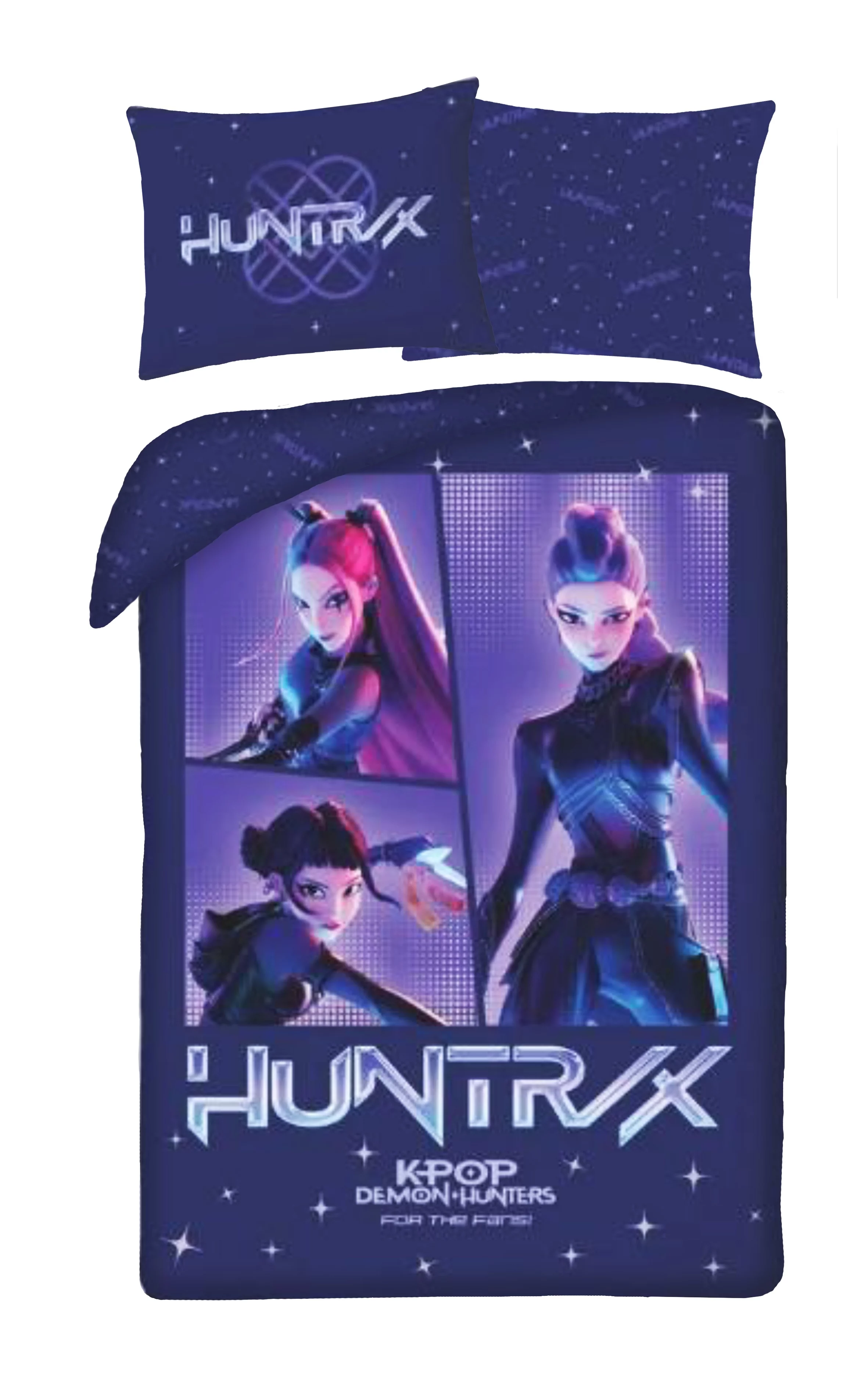 Vstúpte do temnejšej stránky pódia. Posteľná bielizeň KPop Demon Hunters – Huntrix Dark stavia na hlboké modré tóny, neónové detaily a výrazné portréty hrdiniek, ktoré spájajú idol energiu s nekompromisnou silou.