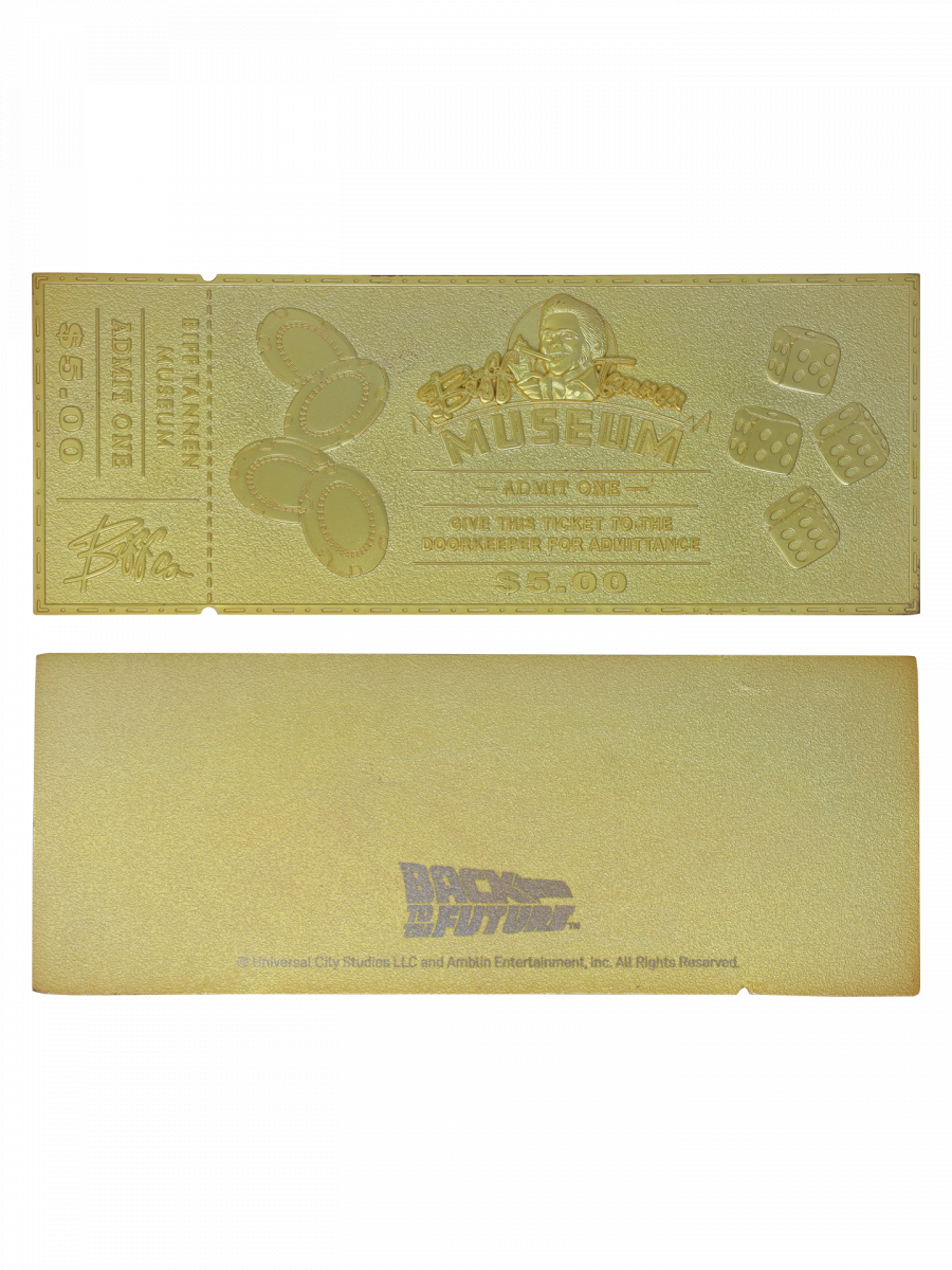 Luxusná replika vstupenky do Biff Tannen Museum poteší každého fanúšika budúcnosti i alternatívnych časových línií. Limitovaná edícia s pozlátením 24 karátov pripomína ikonický moment z druhého filmu a ponúka skutočne zberateľský zážitok.