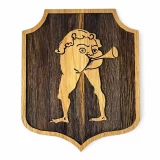 Drevená nástenná ozdoba v tvare vývesného štítu s logom Kingdom Come: Deliverance 2 je vyrobená z dubového dreva.
