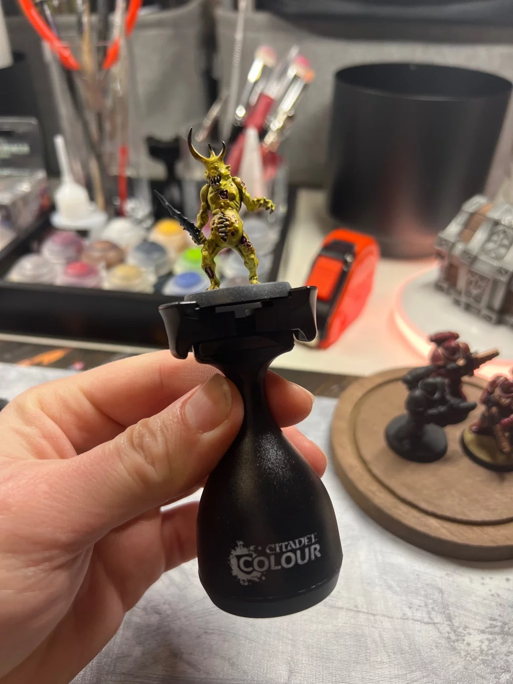 Perfektní držák na figurky při barvení. Platforma je stlačovaná pružinkou a drží dostatečně, nicméně zářezy by mohly být trochu hlubší, aby byla základna fixována o malinko pevněji. Jinak mu asi není co vytknout. Dobře se drží a díky zúžení v horní části se s ním dobře manipuluje.