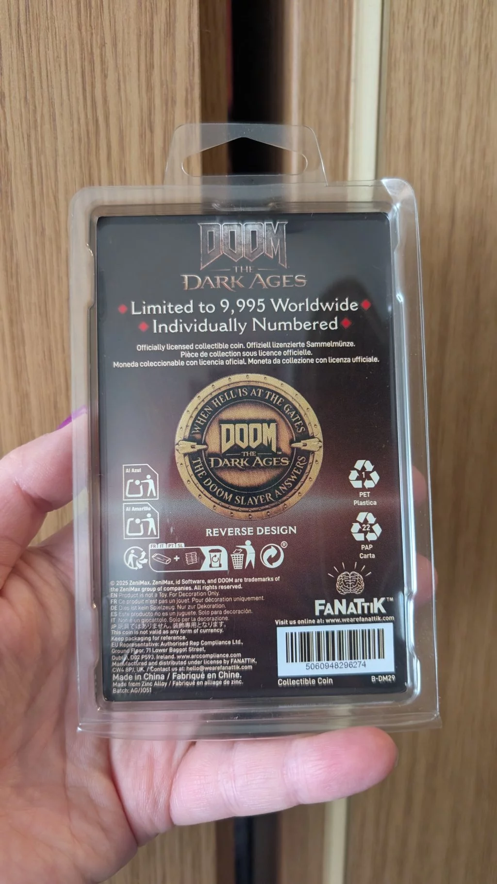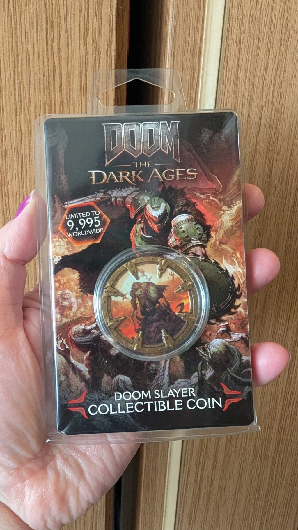 Osláv drsný a nekompromisný odkaz hry DOOM: The Dark Ages s touto limitovanou zberateľskou mincou. Minca je zasadená do unikátneho okraja v tvare štítu, inšpirovaného deluxe edíciou, a na jej prednej strane nájdeš ikonického Slayera v detailnom spracovaní. Po otočení uvidíš embosované logo Dark Ages na zadnej strane.