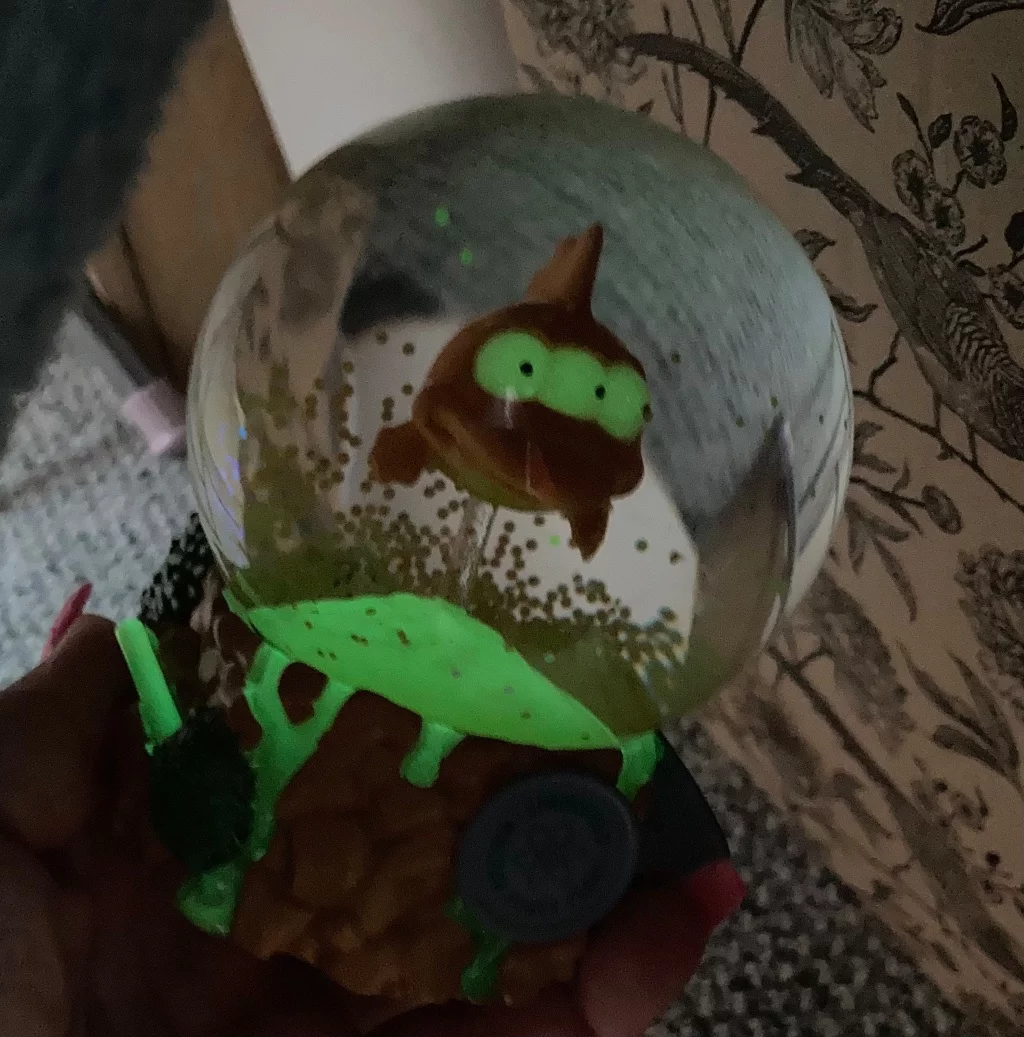 Krásna ozdoba v podobe snehovej gule s trojokou rybou, ktorú môžete poznať z populárneho animáku The Simpsons. Niektoré z plôch sú natreté luminiscenčným atramentom, ktorý po nasvietení v tme svieti.Rozmery: cca 8 x 10 x 8 cm