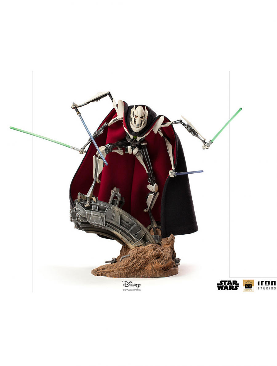 Iron Studios hrdě představuje sošku „General Grievous Deluxe BDS Art Scale 1/10 - Star Wars“ s tělem kyborga, díky kterému má lepší bojové schopnosti. Tento hrůzostrašný nepřítel řádu Jedi je připraven vyhladit každého, kdo se mu postaví do cesty. Grievous pochází z planety Kalee. V minulosti byl skvělým válečníkem, později se stal odborníkem na vojenskou strategii a taktiku. Poté, co utrpěl vážnou nehodu, která ho téměř zabila, dostal několik kyberimplantátů, díky nimž je jeho tělo více strojem než živou tkání. Svou skutečnou tvář skrývá pod maskou a jeho robotické tělo mu přikrývá plášť.Figúrka má ľahko poškodený obal, figúrka je v úplnom poriadku.