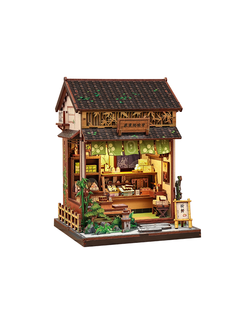 Objavte kúzlo tradičnej japonskej cukrárne s detailnou stavebnicou CuteBee - Kanmi-dokoro Kurihara. Drevená fasáda, látkové závesy nad vstupom, drobné dekorácie a teplé osvetlenie vytvárajú autentickú atmosféru malého obchodíka plného sladkých dobrôt.
