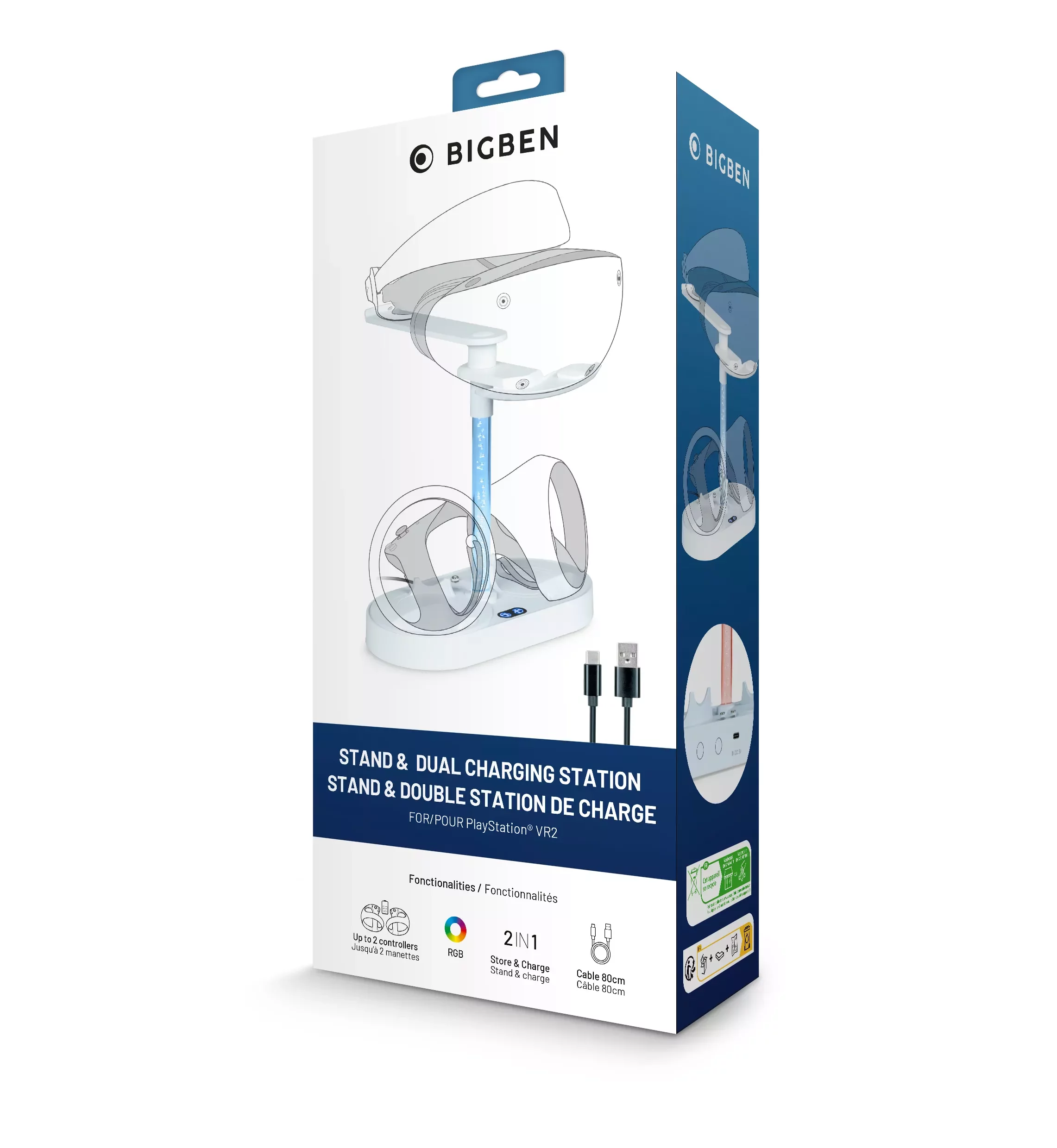 Vystavte svoju hernú súpravu PlayStation VR2 všetkým na obdiv a zároveň pri tom nechajte nabíjať oba jej ovládače PS VR2 Sense! Vzhľadom na to, že náhlavnú súpravu nie je nutné nabíjať, slúži stojan iba na jej odloženie. Ovládače potom stačí jednoducho umiestniť na nabíjaciu stanicu, pričom priebeh ich nabíjania môžete po celý čas sledovať s pomocou príslušných LED ukazovateľov. Na zadnej strane nabíjacej stanice sa navyše nachádza tlačidlo umožňujúce vám ľahko meniť podobu farebného svetelného efektu stojanu. V balení potom nájdete aj 80cm napájací kábel.VLASTNOSTI