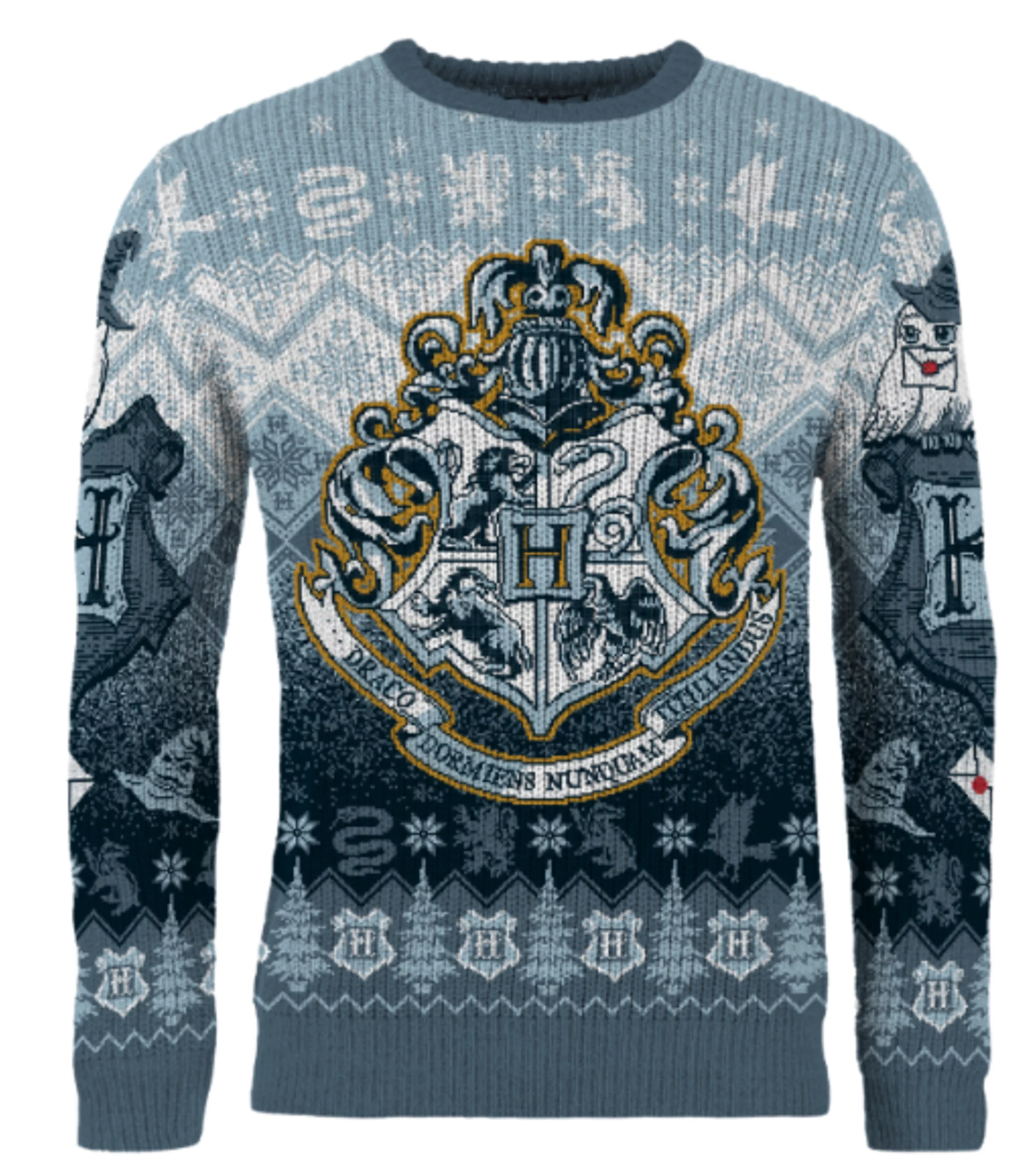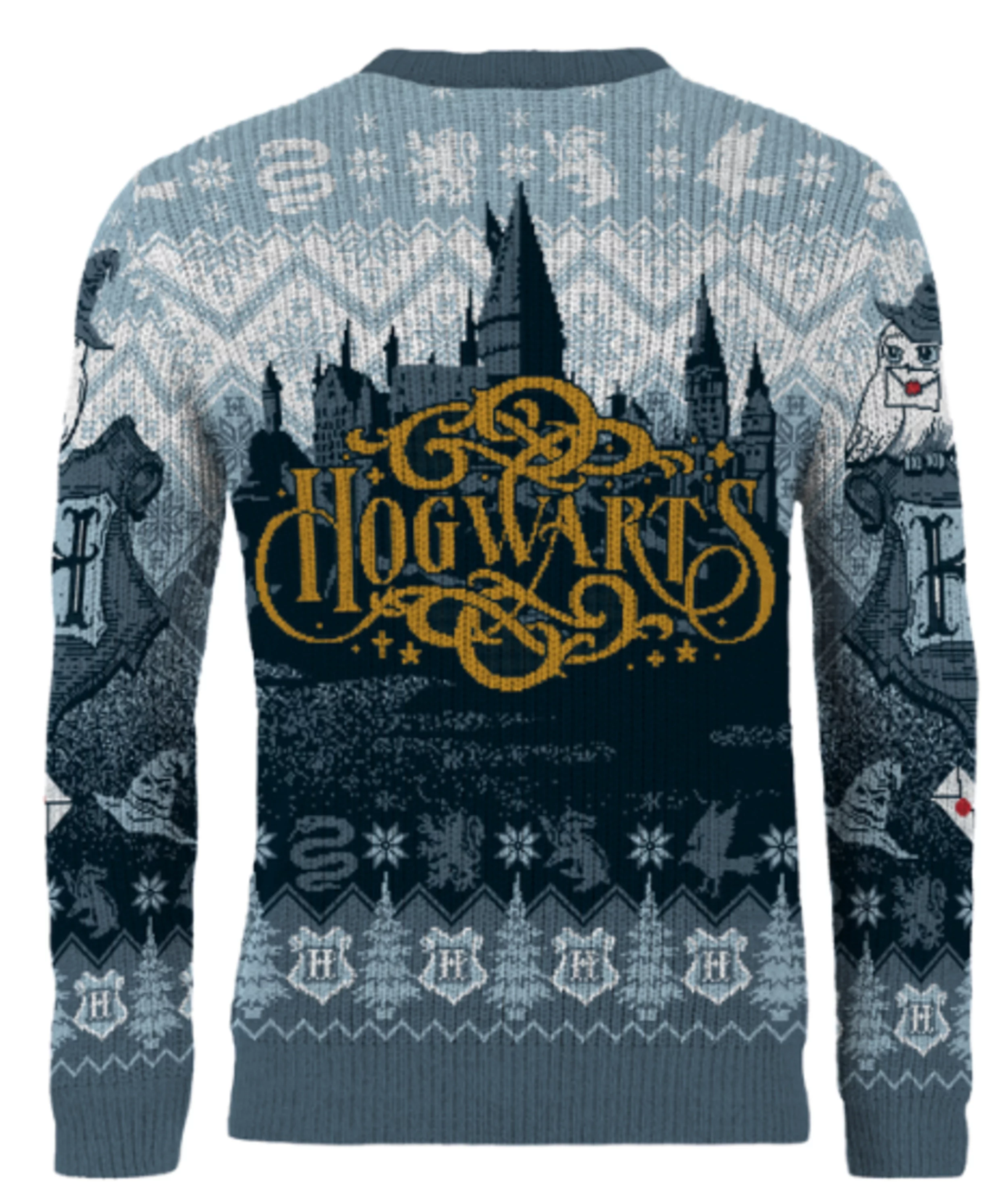 Sveter Harry Potter - Hogwarts Christmas je dokonalým spoločníkom pre sviatočné obdobie každého čarodejníka aj mudlami. Predná strana sa pýši erbom Rokfortu so zvieratami štyroch koľají, zadná potom siluetou majestátnej školy s nápisom Hogwarts. Štýlové zimné vzory a kúzelnícke detaily dodávajú svetru magickú atmosféru, vďaka ktorej sa budeš cítiť ako na vianočnej hostine vo Veľkej sieni.Materiál: 100% akryl