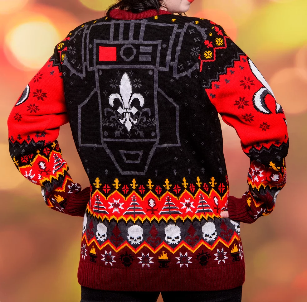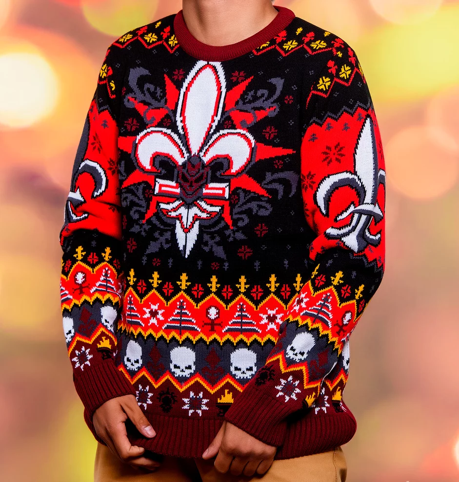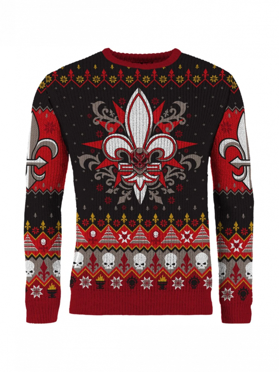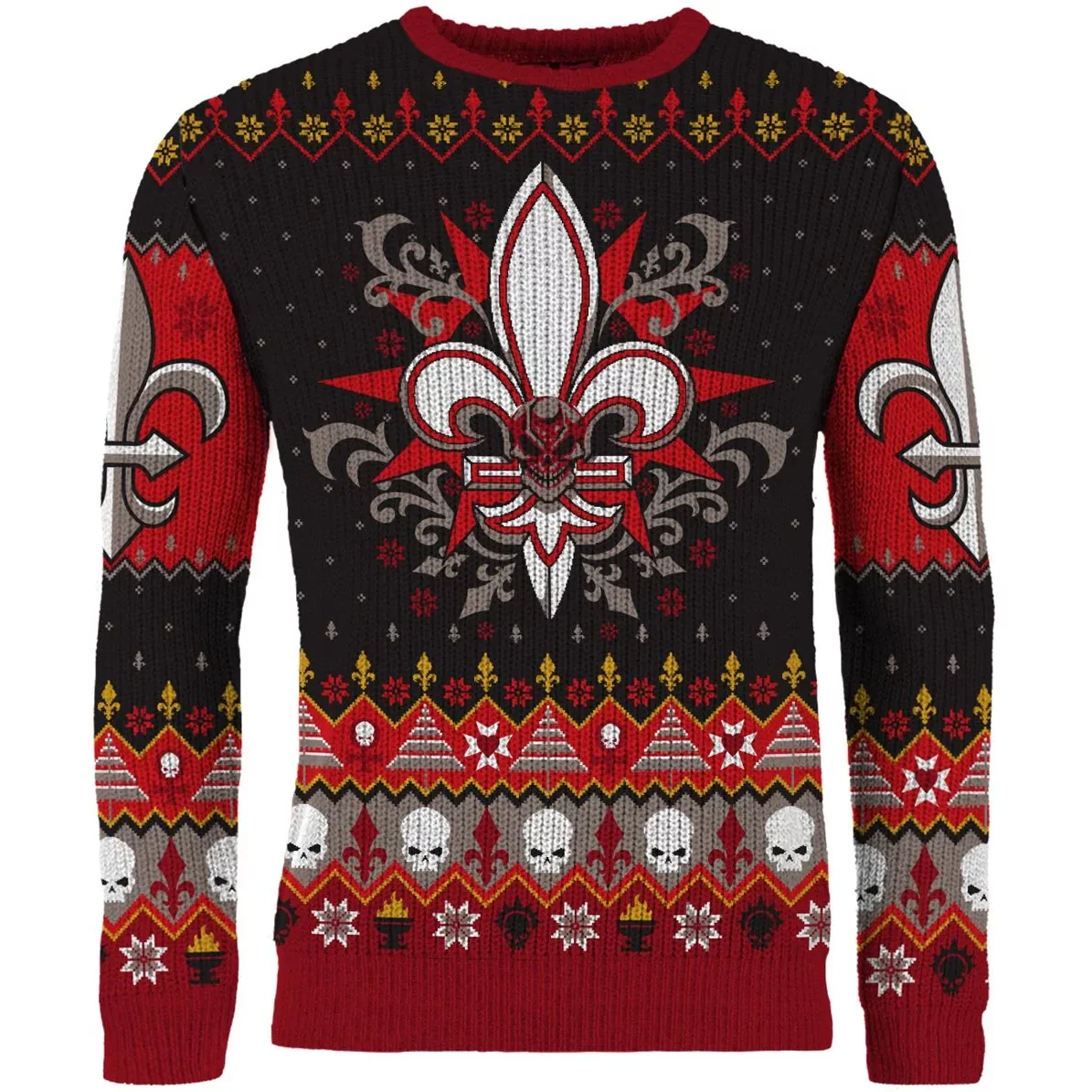 Vianočný sveter vo farbách a symboloch Sisters of Battle poteší každého fanúšika Warhammer 40,000. Výrazný motív ľalie doplnený lebkami a sviatočnými vzormi spája temnotu grimdarčeka s vianočnou pohodou.