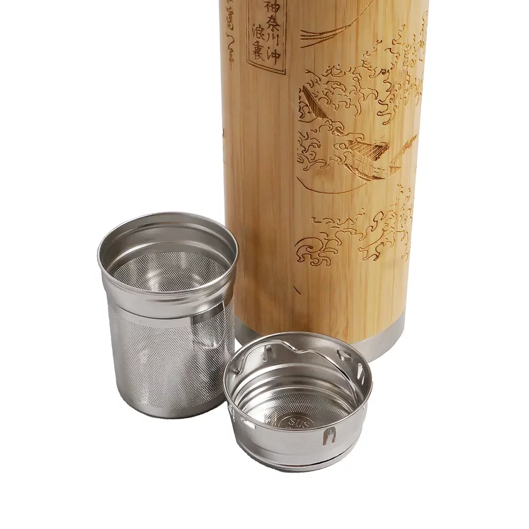Elegantná bambusová fľaša s jemne vyrytým motívom slávneho diela The Great Wave off Kanagawa od Hokusaiho je ideálna pre milovníkov čaju aj umenia.
