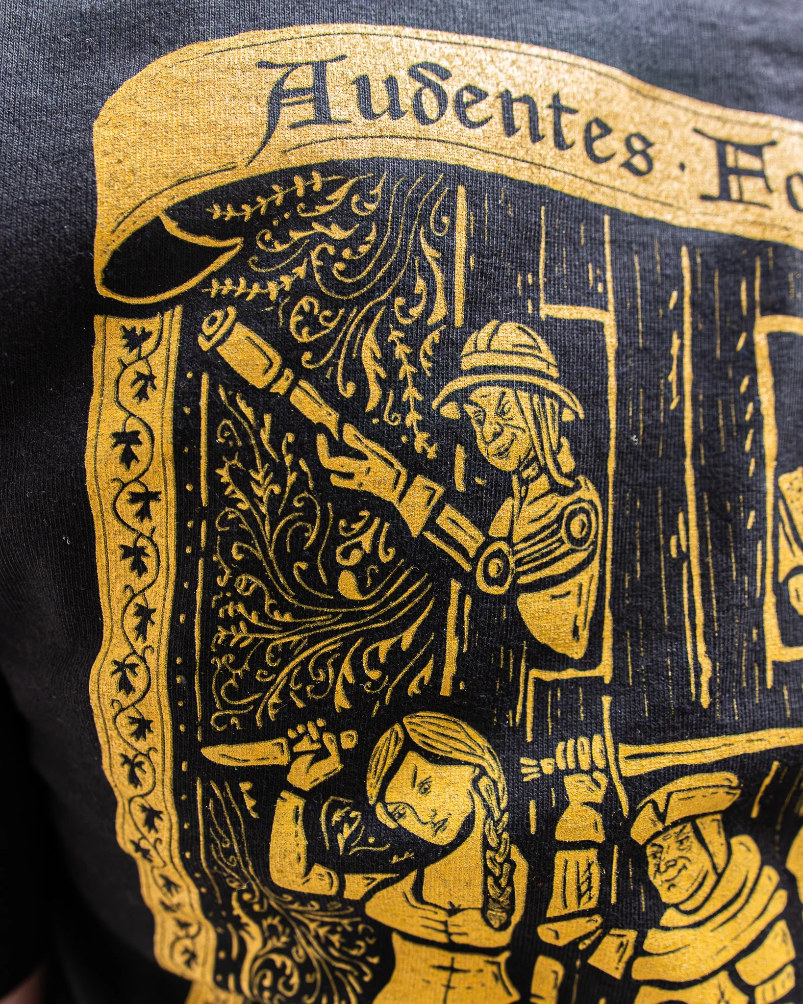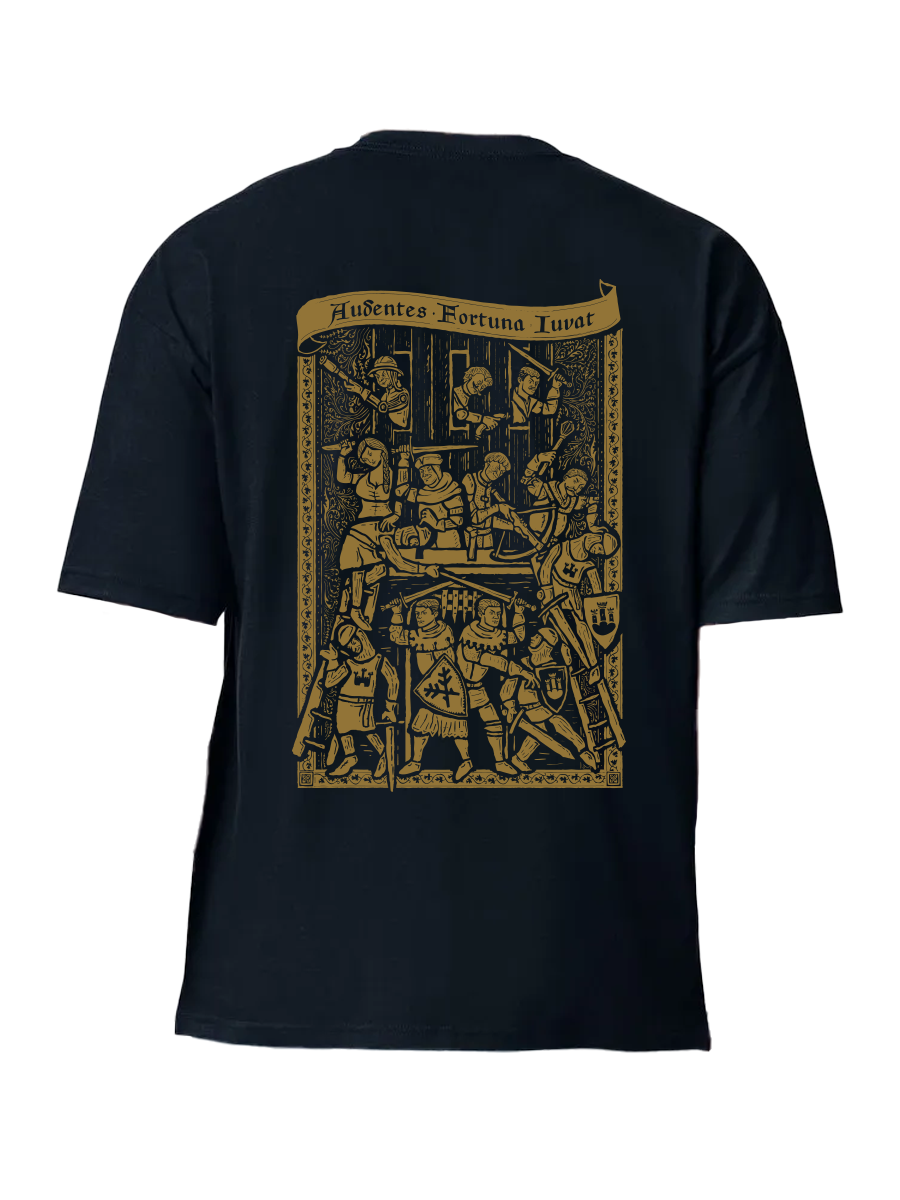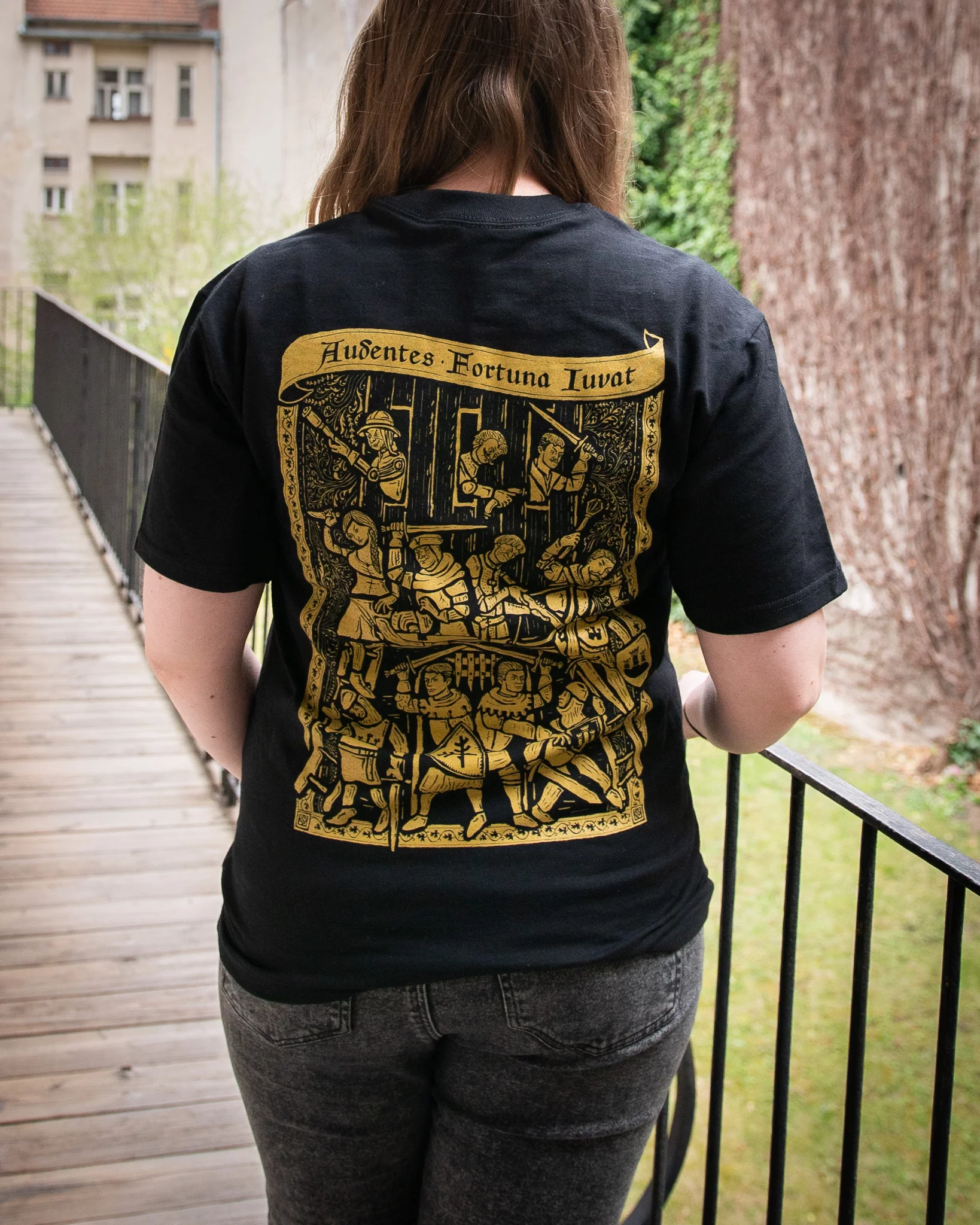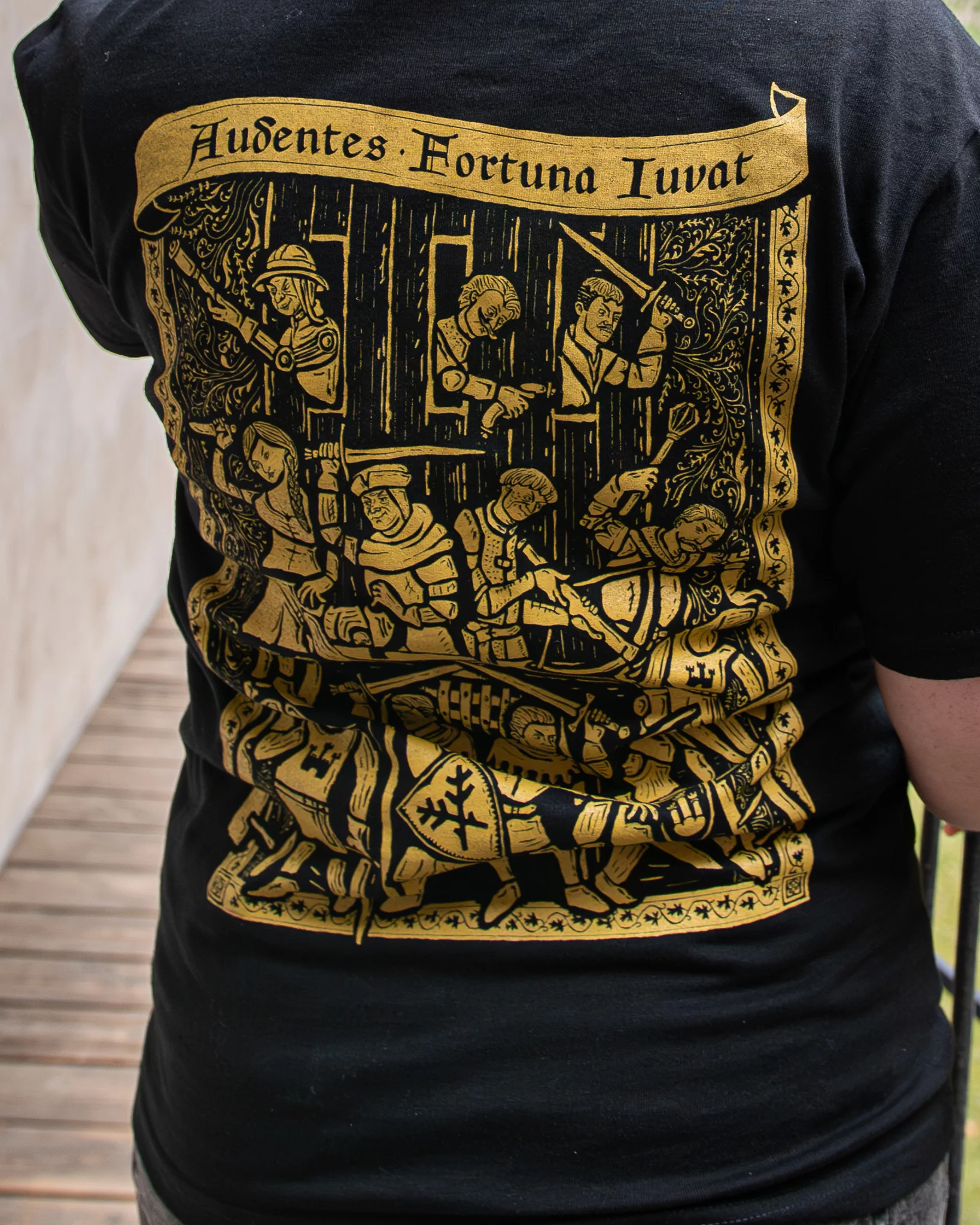 Suchdol patrí k momentom, na ktoré sa vo Kingdom Come: Deliverance II jednoducho nezabúda. Bitka, kde sa láme situácia, všade je chaos a vy len dúfate, že to nejako dopadne. Práve túto atmosféru sme preniesli na chrbát trička v podobe ilustrácie inšpirovanej stredovekými rytinami, kde nechýbajú všetci najobľúbenejší hrdinovia. Čím dlhšie sa na ňu pozeráte, tým viac detailov objavíte.