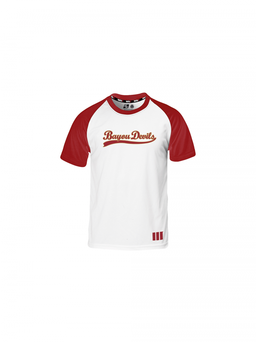 Štýlové tričko vo farbách miestneho baseballového tímu Bayou Devils.