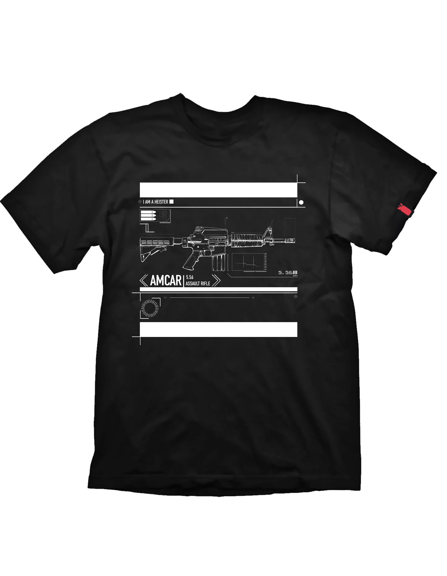 Kvalitné čierne bavlnené tričko s potlačou a motívom blueprintu zbrane Amcar pre fanúšikov online akcie Payday 2.Materiál: 100% bavlna